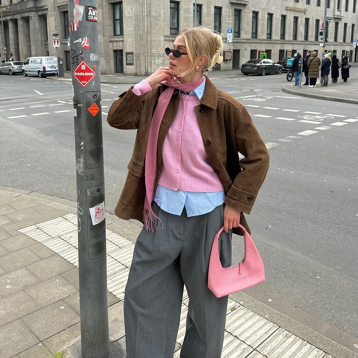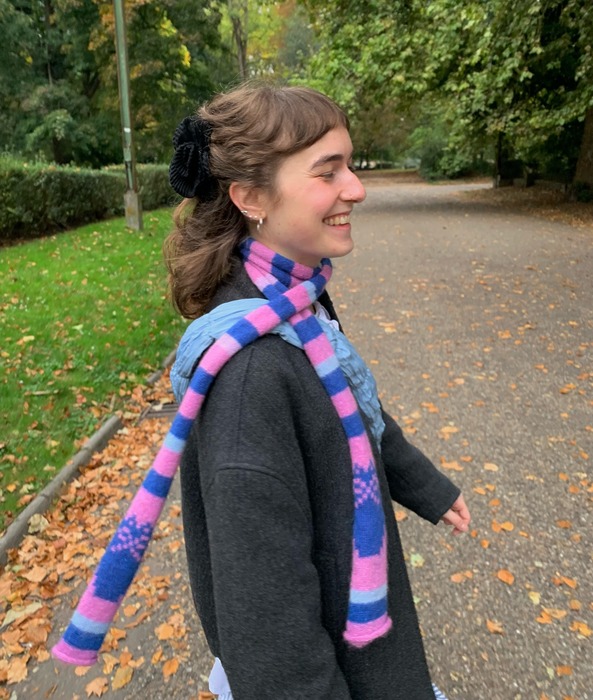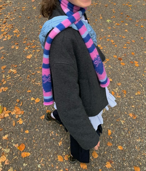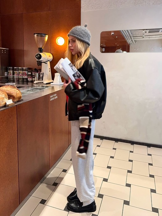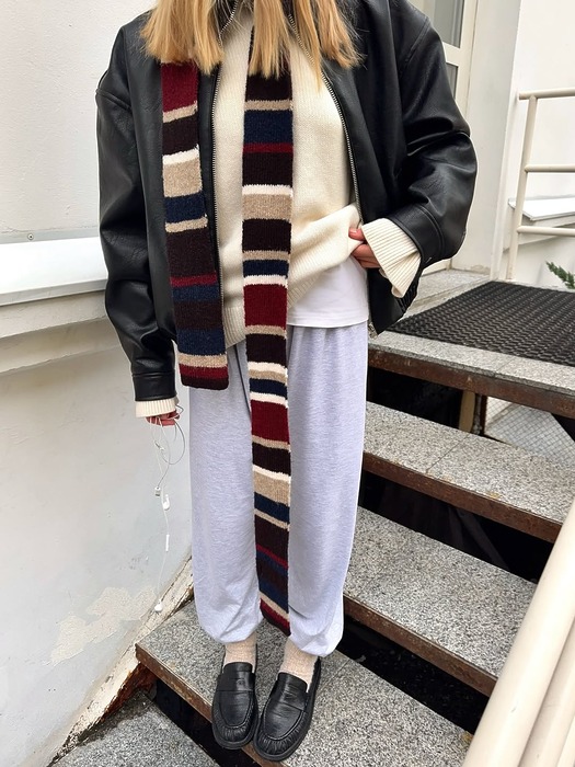 컬러가 여러 개 섞인 멀티 컬러 스카프는 의외로 스타일링이 쉬운 아이템입니다. 레더 재킷, 스웨트 팬츠처럼 무채색 기반의 편안한 룩에도 자연스럽게 어울리고, 전체적인 스타일에 산뜻한 생기를 넣어주죠. 비비드보다는 톤 다운된 컬러 조합을 고르면 룩 전체에 과하지 않은 포인트를 더할 수 있을 거예요.