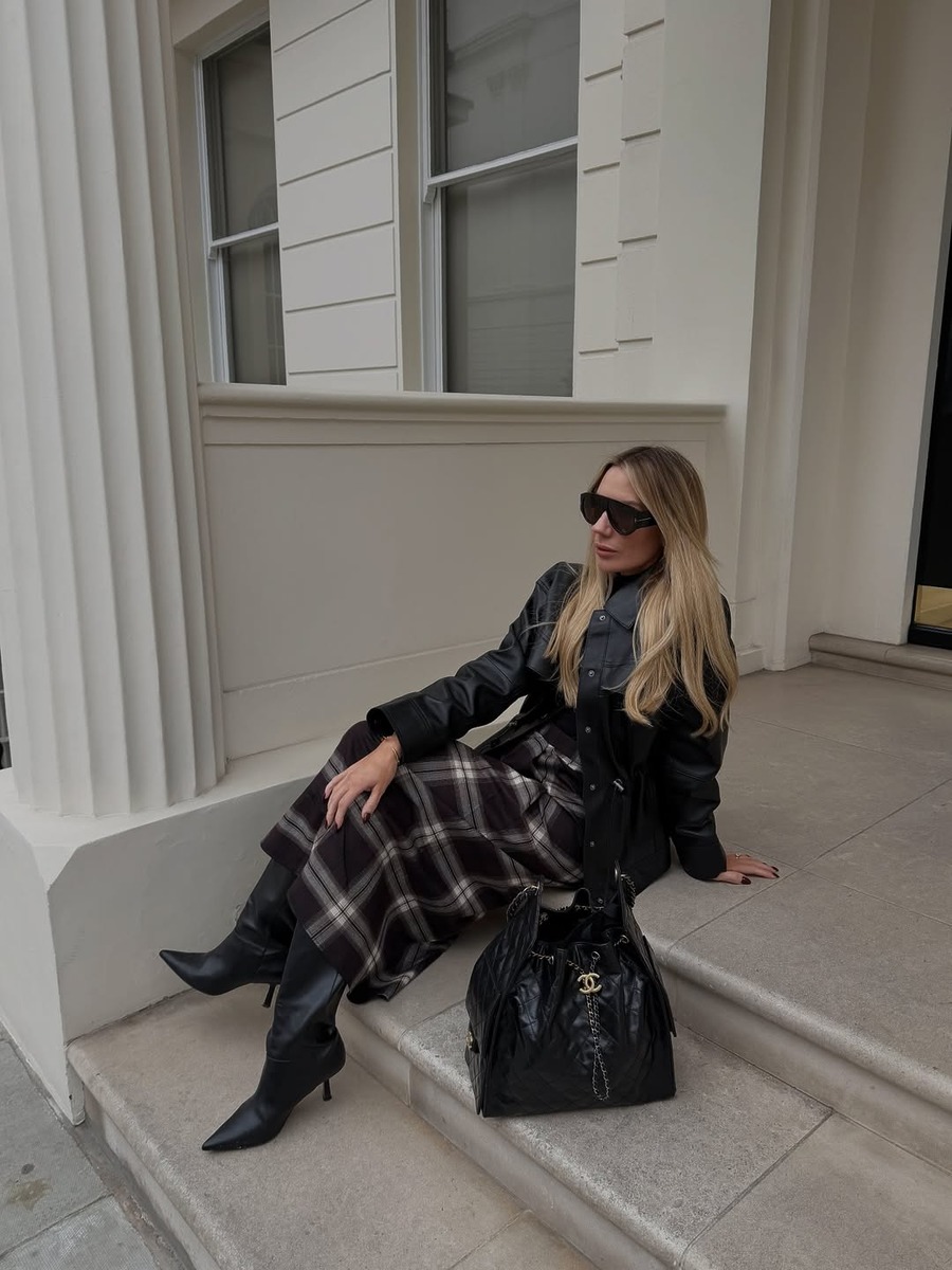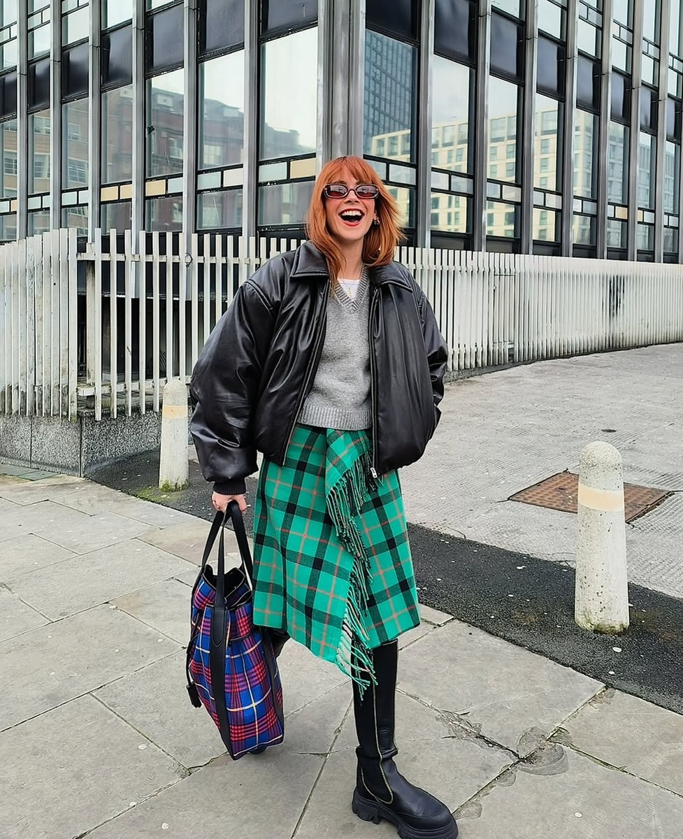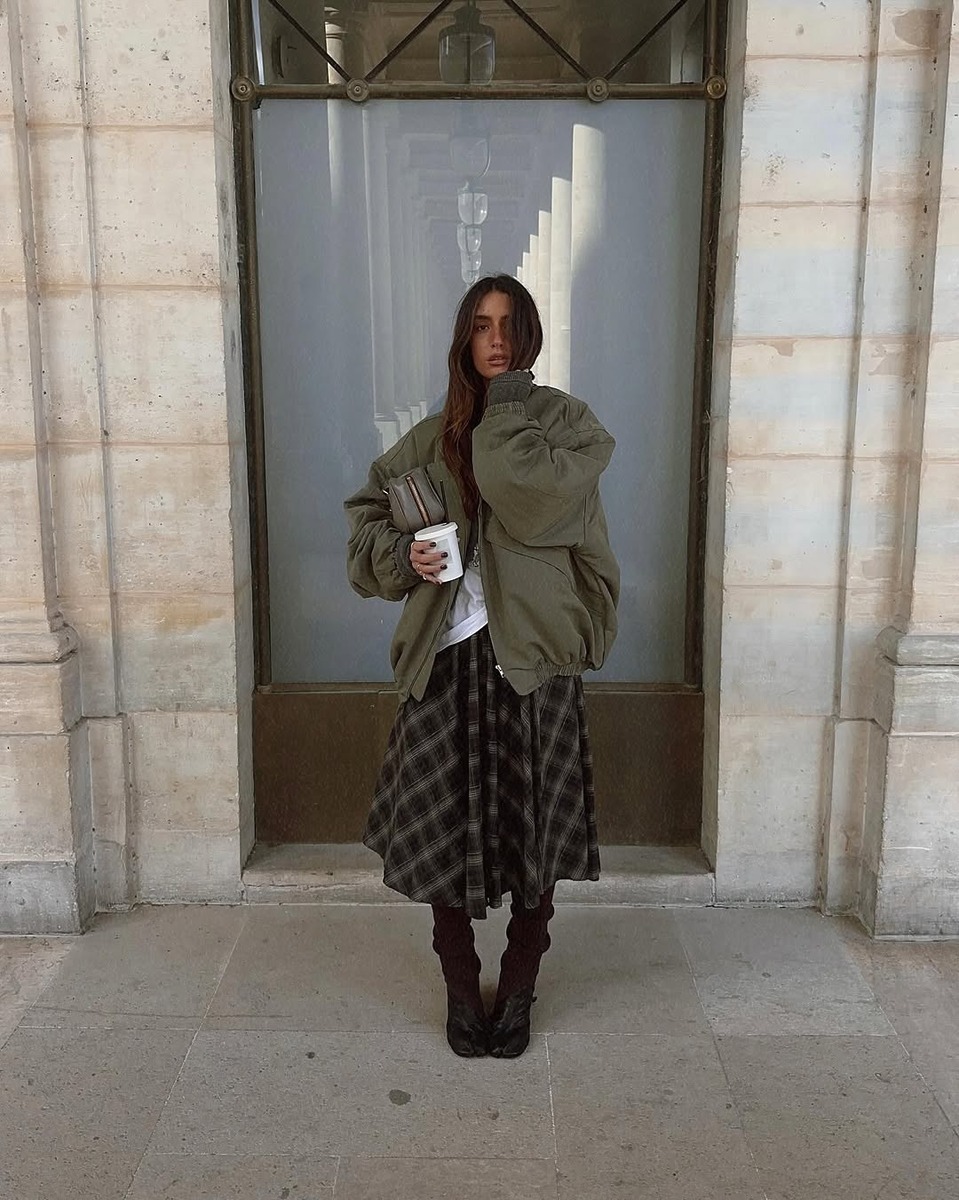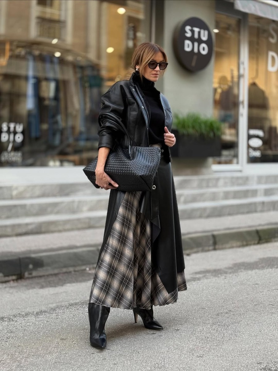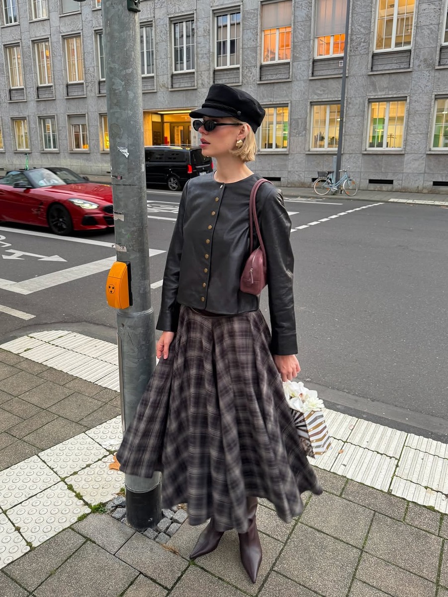 롱 체크 스커트와 함께 입을 아우터를 선택할 때 가장 신경써야 하는 부분은 바로 실루엣의 균형이에요. 클래식한 더블 브레스티드 롱코트나 오버사이즈 코트보다는 크롭 기장의 레더 블루종, 짧은 패딩, 퍼 재킷 등이 잘 어울려요. 길이의 대비가 생기면서 발랄하고 모던한 분위기가 살아나기 때문이죠. 특히 레더 블루종처럼 무게감 있는 아우터를 선택하면 룩이 전체적으로 트렌디해보일 수 있어요. 아우터의 실루엣에 따라 체크 스커트의 매력이 달라진다는 점을 꼭 기억하세요!