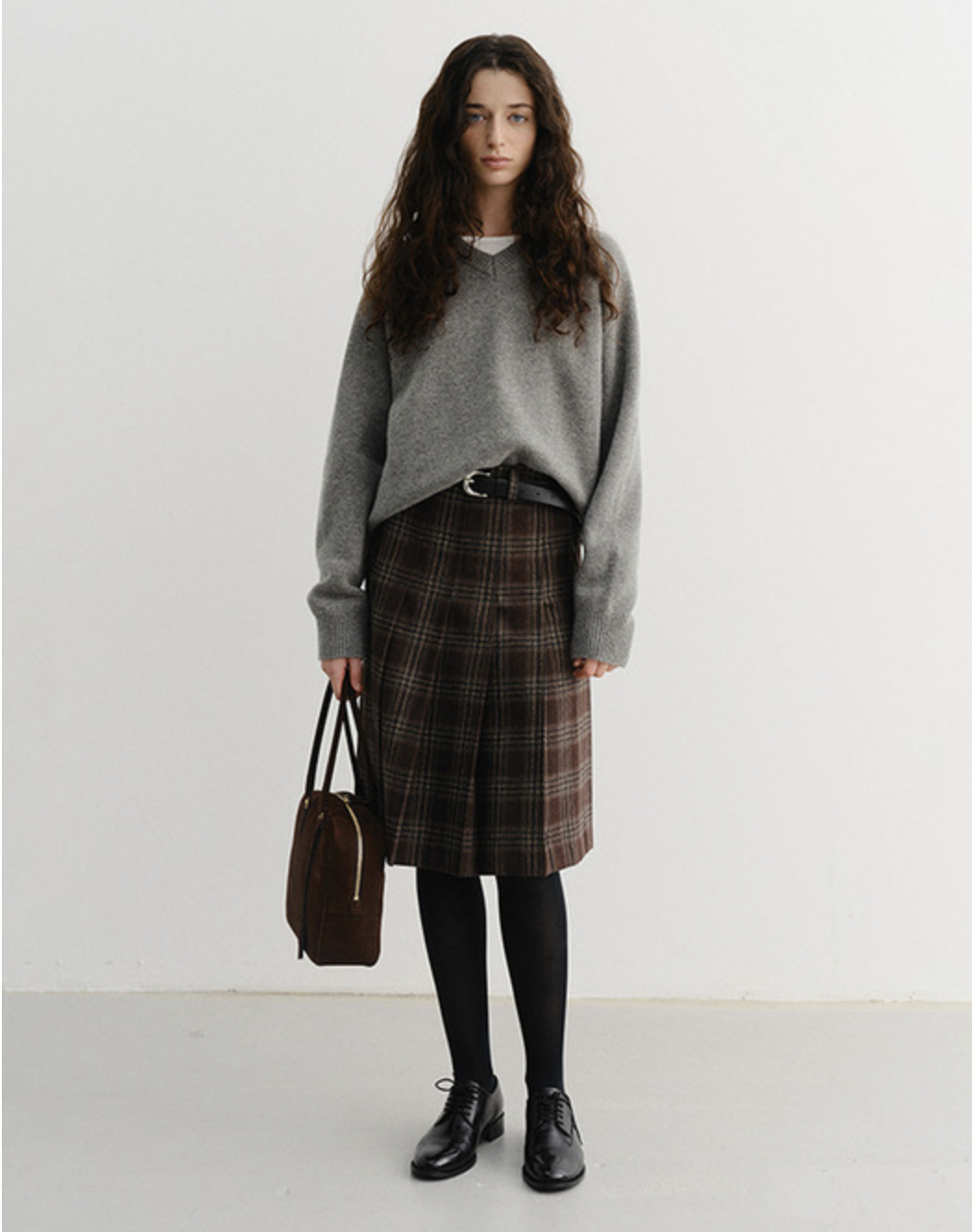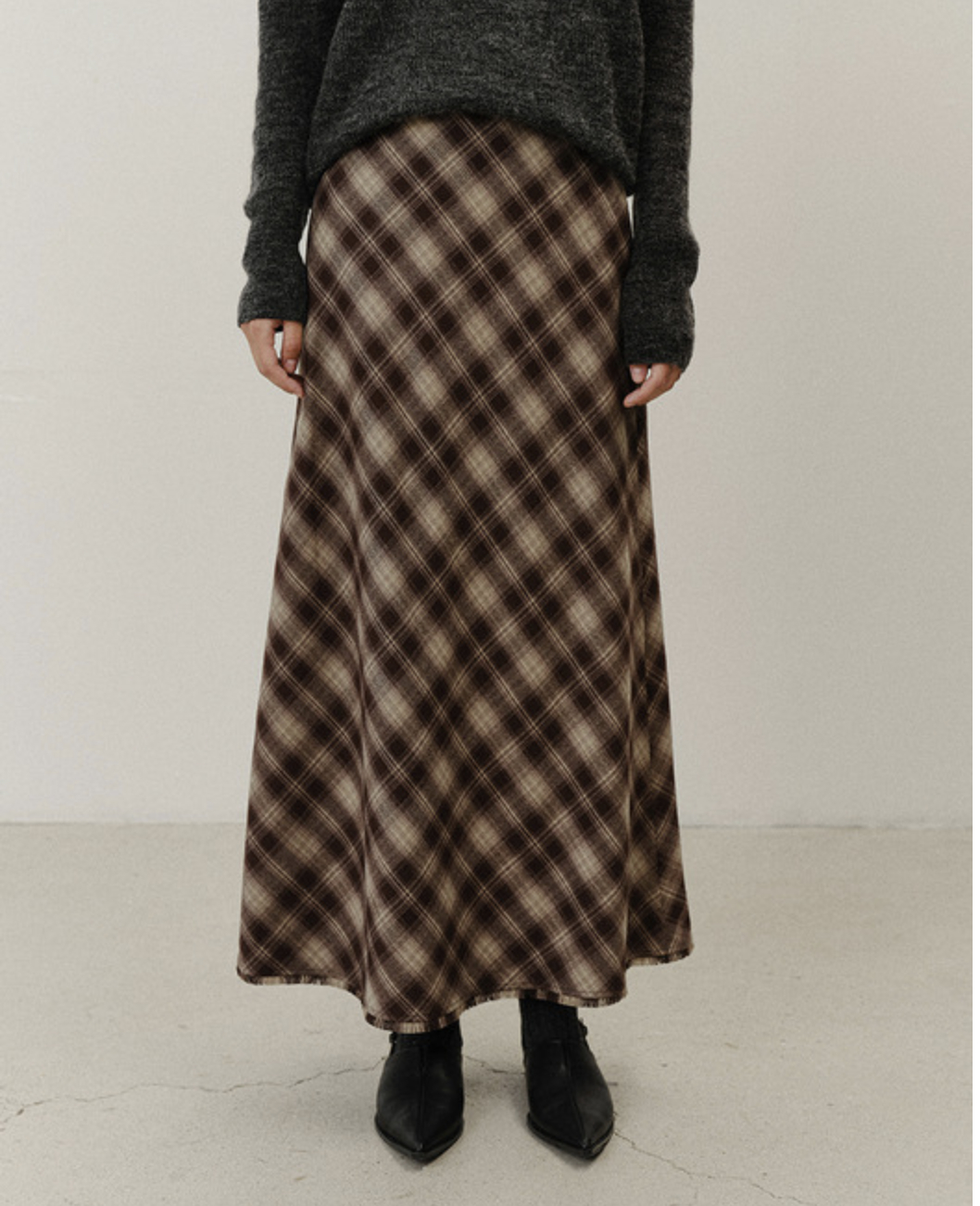 겨울에 가장 손이 자주 가는 컬러는 역시 브라운과 그레이, 블랙이죠. 특히 브라운 컬러는 올겨울 가장 뜨거운 컬러 중 하나에요. 이 컬러들이 믹스된 체크 스커트는 우아하고 따뜻한 분위기를 만들어줘요. 브라운 계열의 체크는 코지한 니트와 매치해 자연스럽게 계절감을 강조할 수 있고, 그레이 체크는 모노톤 상의나 아우터와 탁월한 궁합을 보이며 시크하고도 세련된 겨울 스타일링을 완성하죠. 이런 컬러를 입은 체크는 패턴이 과하지 않게 느껴져 데일리 룩은 물론 오피스 룩에도 손쉽게 활용할 수 있어요.