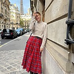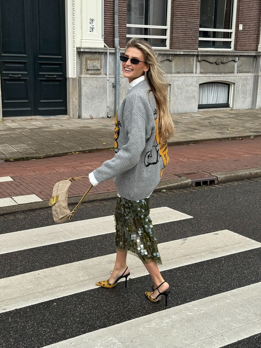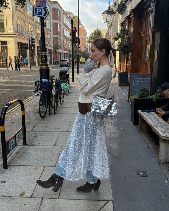 시퀸처럼 화려한 아이템을 스타일에 더할 때 다른 것들은 실루엣이나 컬러가 심플한 것을 매치해 주는 것이 좋습니다. 인플루언서 테사는 상당히 커다란 시퀸으로 마치 물고기 비늘처럼 반짝이는 H 라인 스커트에 고양이 캐릭터, 가필드가 그려져 캐주얼한 느낌이 지배적인 오버핏 그레이 니트를 매치했어요. 손에 든 펜디의 금빛 바게트 백은 함께 화려함을 어필하는 동시에 니트에 그려진 가필드의 노란색을 받아줘 액세서리로 훌륭하게 활약하고 있습니다.