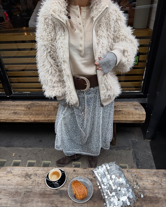 패션 인플루언서 지지는 말티즈를 연상케 하는 귀여운 퍼 재킷과 팬츠 위에 레이어링 해 준 반짝임이 더해진 얇은 스커트, 라반의 스팽글 메탈 백으로 좀 더 따뜻하고 데일리 룩으로 활용 가능한 겨울 글리터 룩을 보여주었습니다. 시퀸과 스팽글 고유 속성으로 액세서리와 스커트는 상당히 화려하지만 그 외의 제품들 색상이 아이보리, 브라운 등 다소 침착한 색상들이라 과해 보이지 않아요.