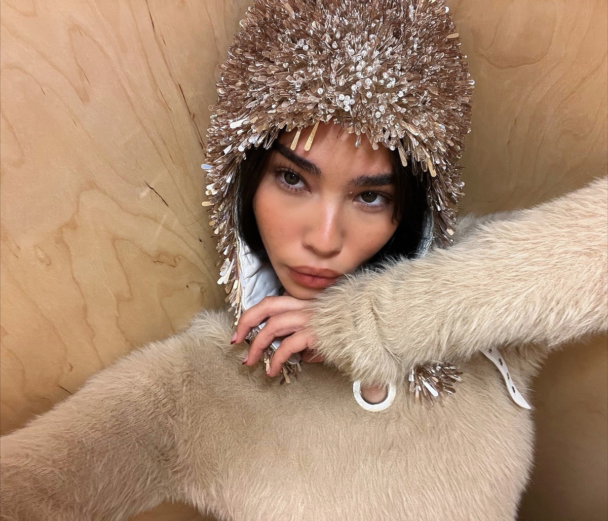 트렌드에 탑승하면서도 스타일이 실패할 가능성을 최소한으로 줄이는 방법은 바로 ‘액세서리’를 활용하는 것! 스타일리스트인 에디는 헤어리한 베이지 니트에 로즈 골드빛 반짝이 수술 장식이 더해진 이어 플롭햇을 착용해 주었습니다. 니트만 입었다면 매우 심플했을 스타일이 블링블링한 모자 덕분에 크리스마스 룩으로 거듭났죠.