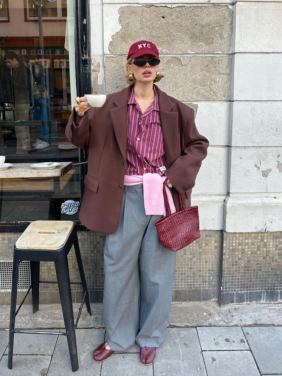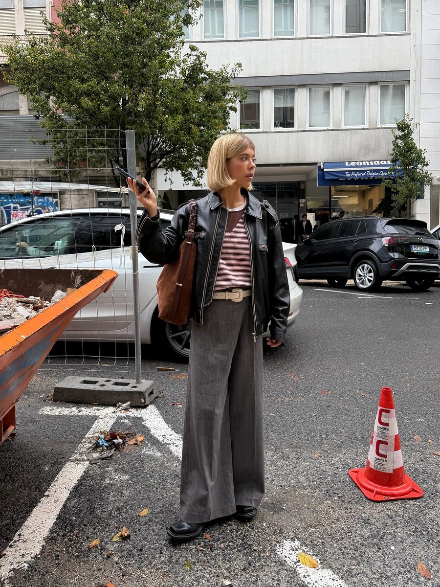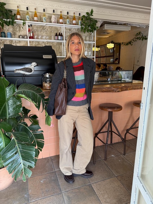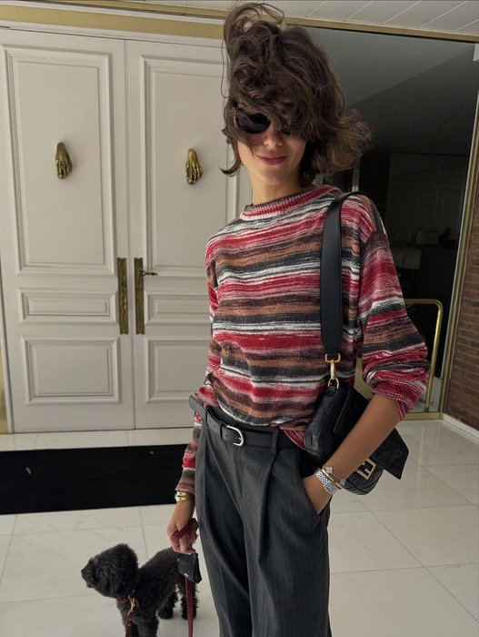 블레이저처럼 단정한 아우터일수록 반전 포인트가 필요하죠. 이너로 멀티 스트라이프 셔츠나 니트를 매치하면 뻔하지 않은 출근룩이 완성됩니다. 스트라이프 속 컬러 중 하나를 골라 액세서리와 맞춰주면 룩 전체가 하나의 세트처럼 묶이며 완성도가 올라가죠.