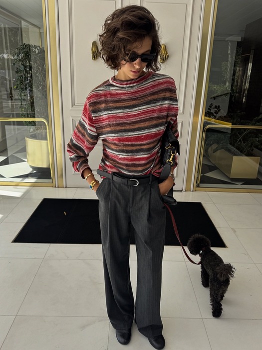 여러 컬러가 섞인 멀티 스트라이프는 자칫 복잡해 보일 수 있어 하의 선택이 중요합니다. 가장 실패 없는 조합은 멀티 스트라이프와 그레이 슬랙스. 화려한 스트라이프가 시선을 끌기 때문에 하의는 심플하고 깔끔할수록 균형이 맞아요. 그레이는 컬러의 톤을 자연스럽게 눌러줘 안정적인 스타일링이 가능합니다. 데일리룩부터 출근룩까지, 어디든 부담 없이 활용할 수 있어 실용적인 조합이죠.