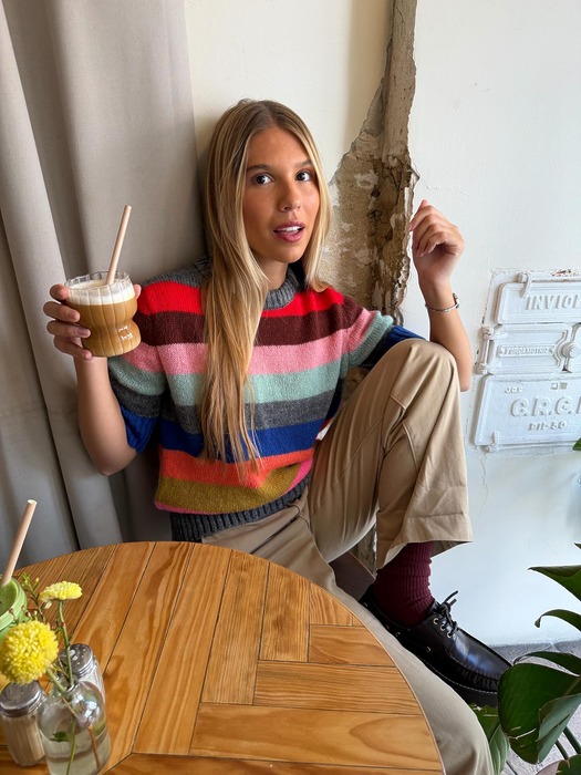 멀티 스트라이프의 매력을 극대화하고 싶다면 비비드 톤을 추천합니다. 카키·브라운처럼 뉴트럴 컬러의 팬츠에 비비드 스트라이프 톱을 더하면 칙칙한 겨울 룩에 단숨에 생기가 살아나요. 코듀로이 또는 두께감 있는 코튼 팬츠를 함께 매치하면 계절감이 더해지고, 깔끔한 로퍼로 마무리하면 단정함과 발랄함을 동시에 챙길 수 있죠.