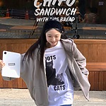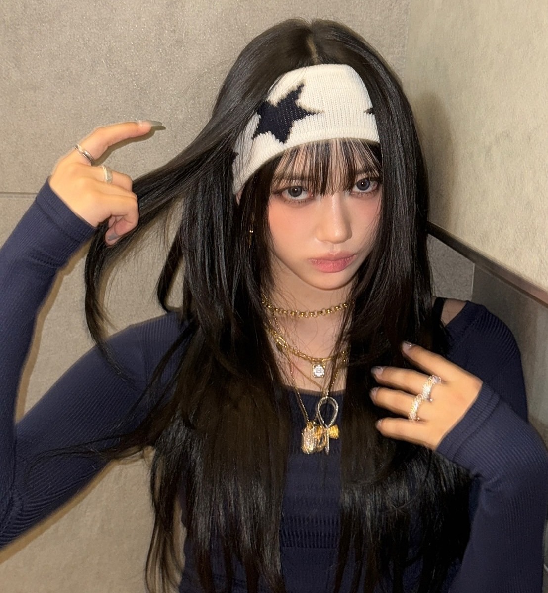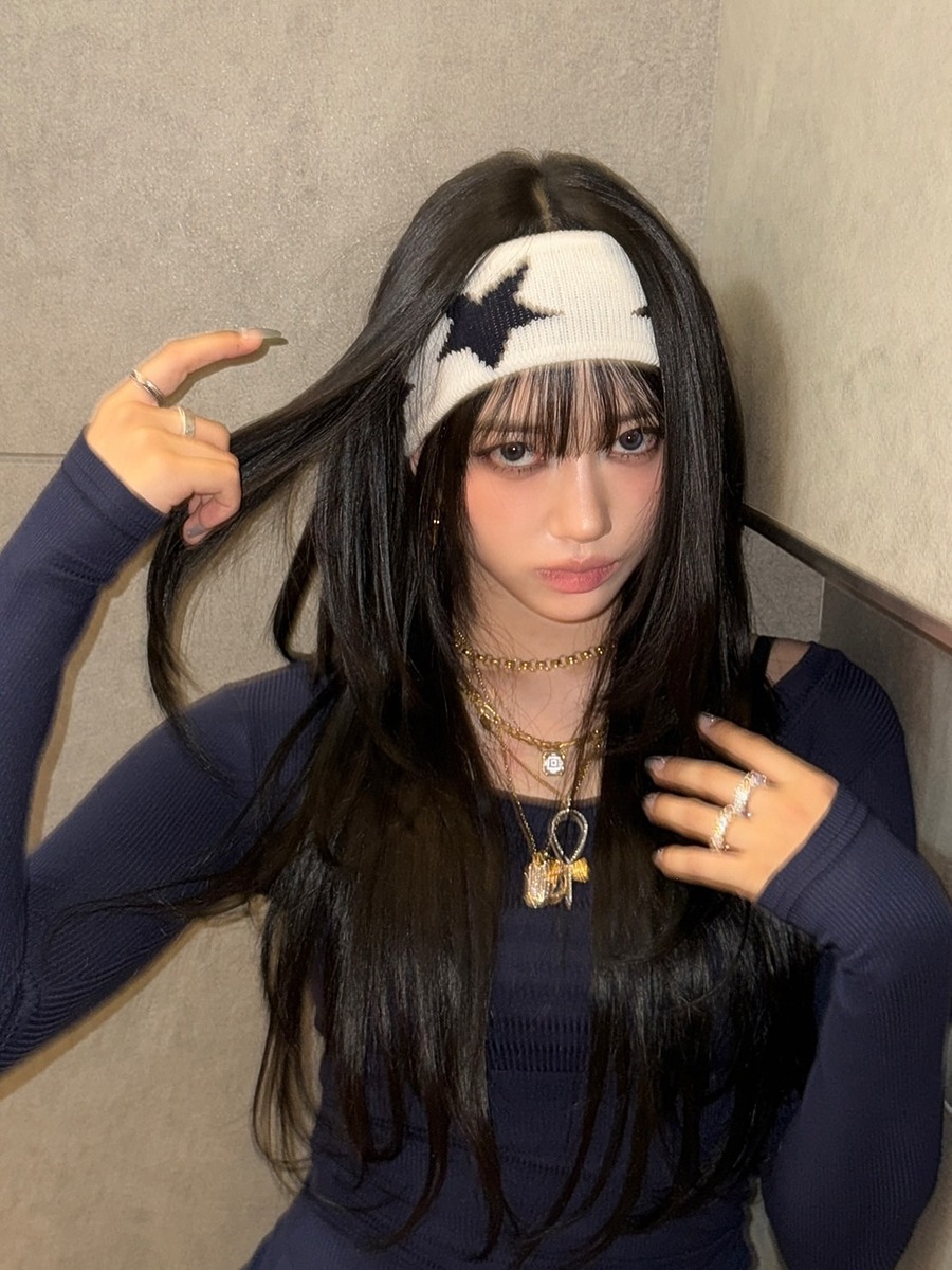 니트 소재 헤드밴드는 겨울 스타일링에서 가장 활용도가 높은 아이템입니다. 미야오 수인은 네이비 롱슬리브에 여러 겹의 골드 네크리스로 무드를 잡고, 화이트 헤드밴드로 힙한 포인트를 더했어요. 어두운 헤어 컬러 위로 자연스럽게 대비되는 화이트 톤이 얼굴을 한층 환하게 밝혀주고, 큼직한 별 패턴 덕분에 펑키한 분위기까지 살아납니다. 심플한 룩에 헤드밴드 하나만 더해도 스타일의 완성도가 확 올라가죠.