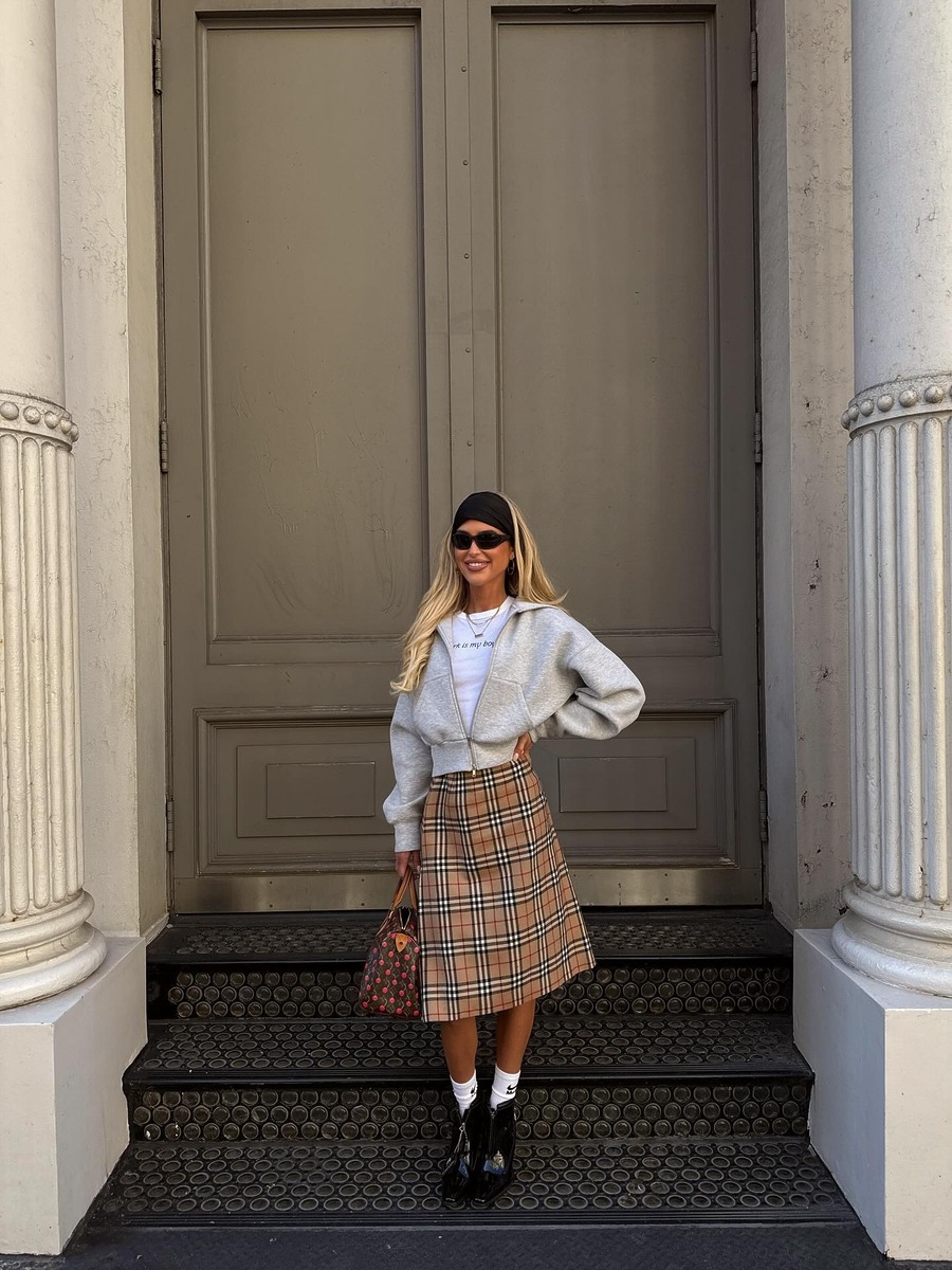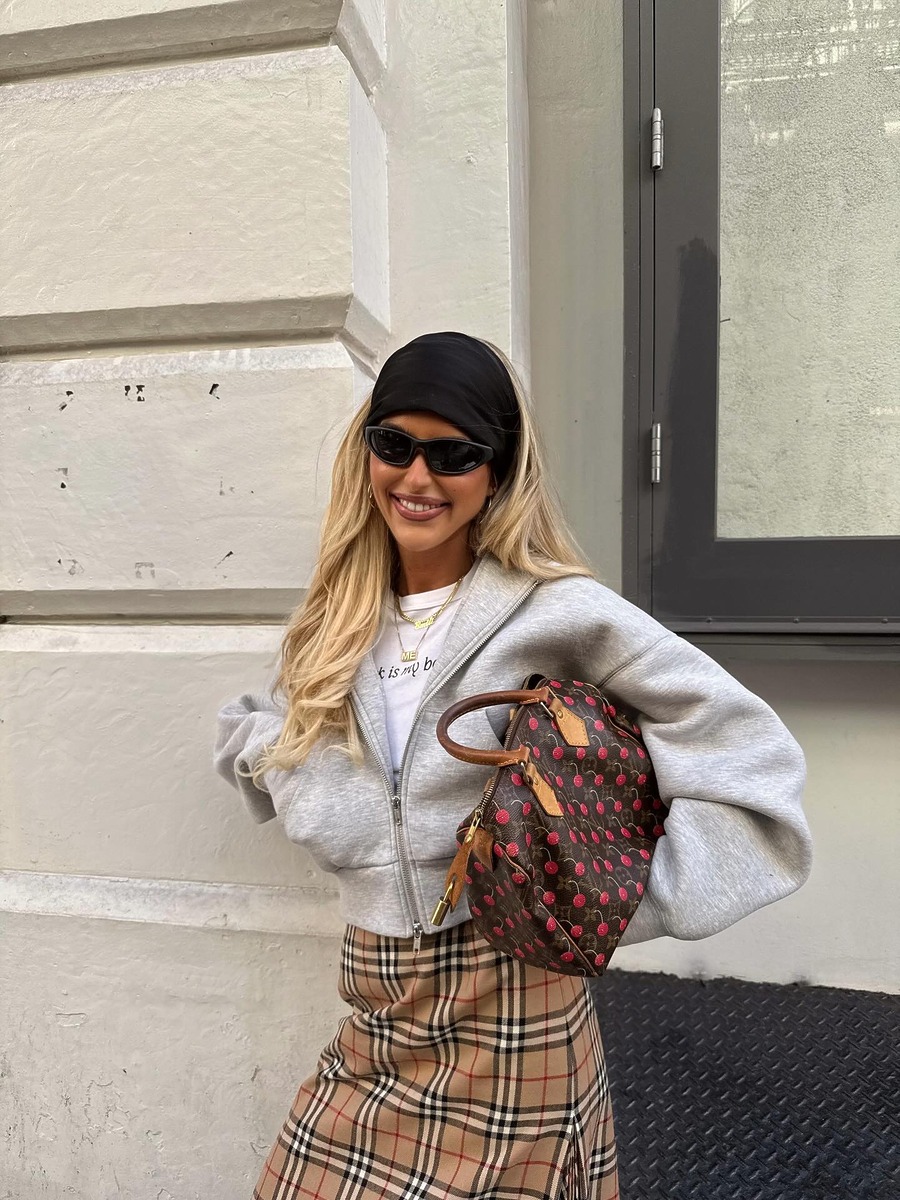 머리가 긴 편이라면, 머리 전체를 감싸는 와이드 헤드밴드를 선택해 보세요. 멜란지 후디와 체크 스커트에 와이드 밴드와 선글라스를 더하면 클래식하면서도 스포티한 90년대 무드가 완성되죠. 비니의 보온성은 유지하고 답답함은 덜어내고 싶을 때 와이드 헤드밴드가 좋은 대안이 되어줄 거예요.