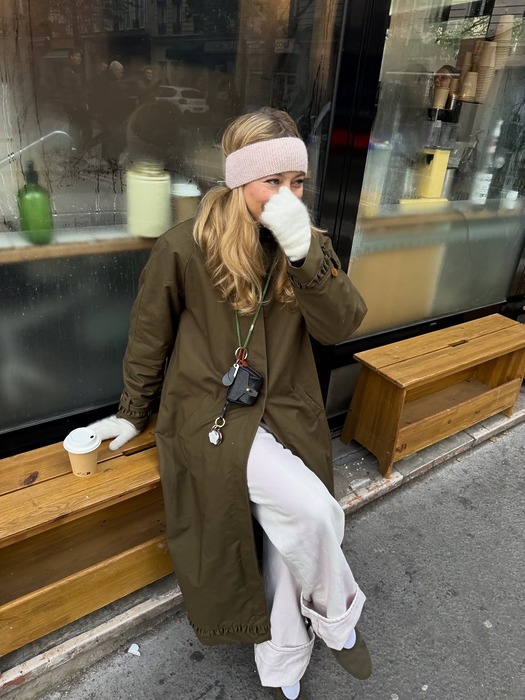 톤다운된 핑크 헤드밴드는 칙칙한 겨울 룩에 은근하게 생기를 더해주는 아이템입니다. 카키 코트와 화이트 데님으로 차분한 톤을 맞춘 뒤, 여기에 톤다운 핑크 밴드를 더하면 얼굴에 자연스러운 혈색이 살아납니다. 이때 밴드가 이마를 덮도록 연출하면 얼굴이 작아 보이고, 머리로 옆 페이스라인을 자연스럽게 가려주면 광대나 헤어라인도 보완할 수 있죠.