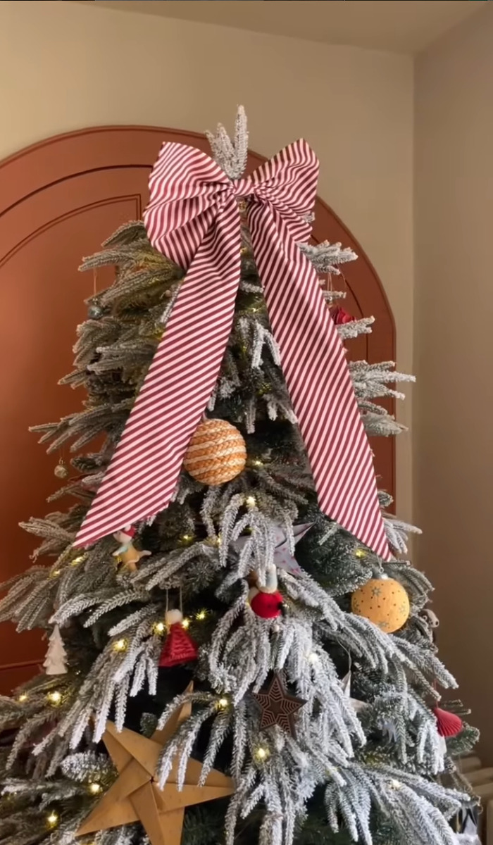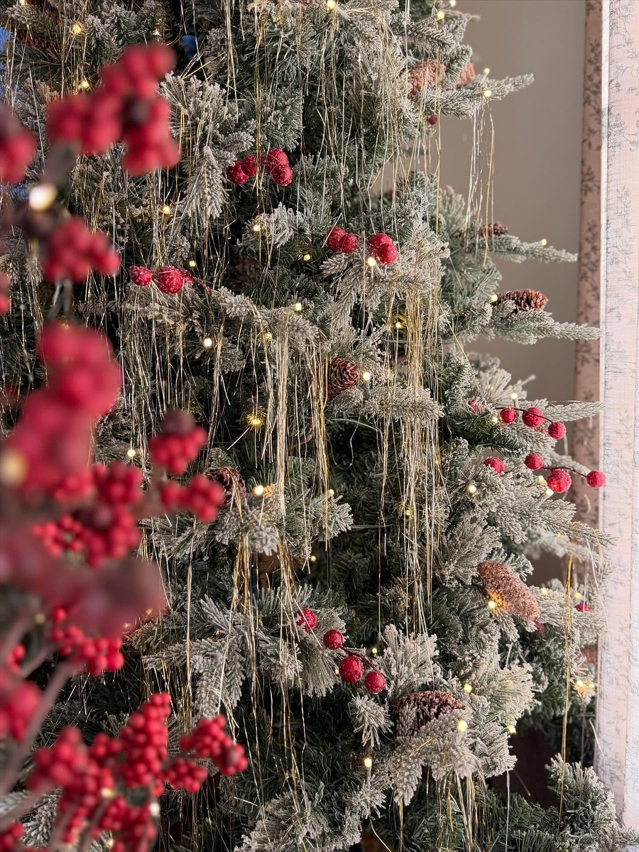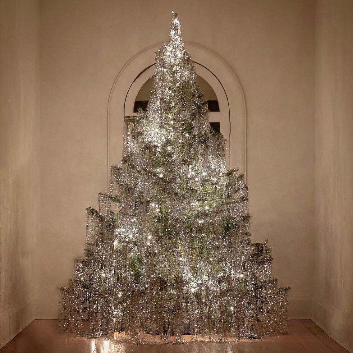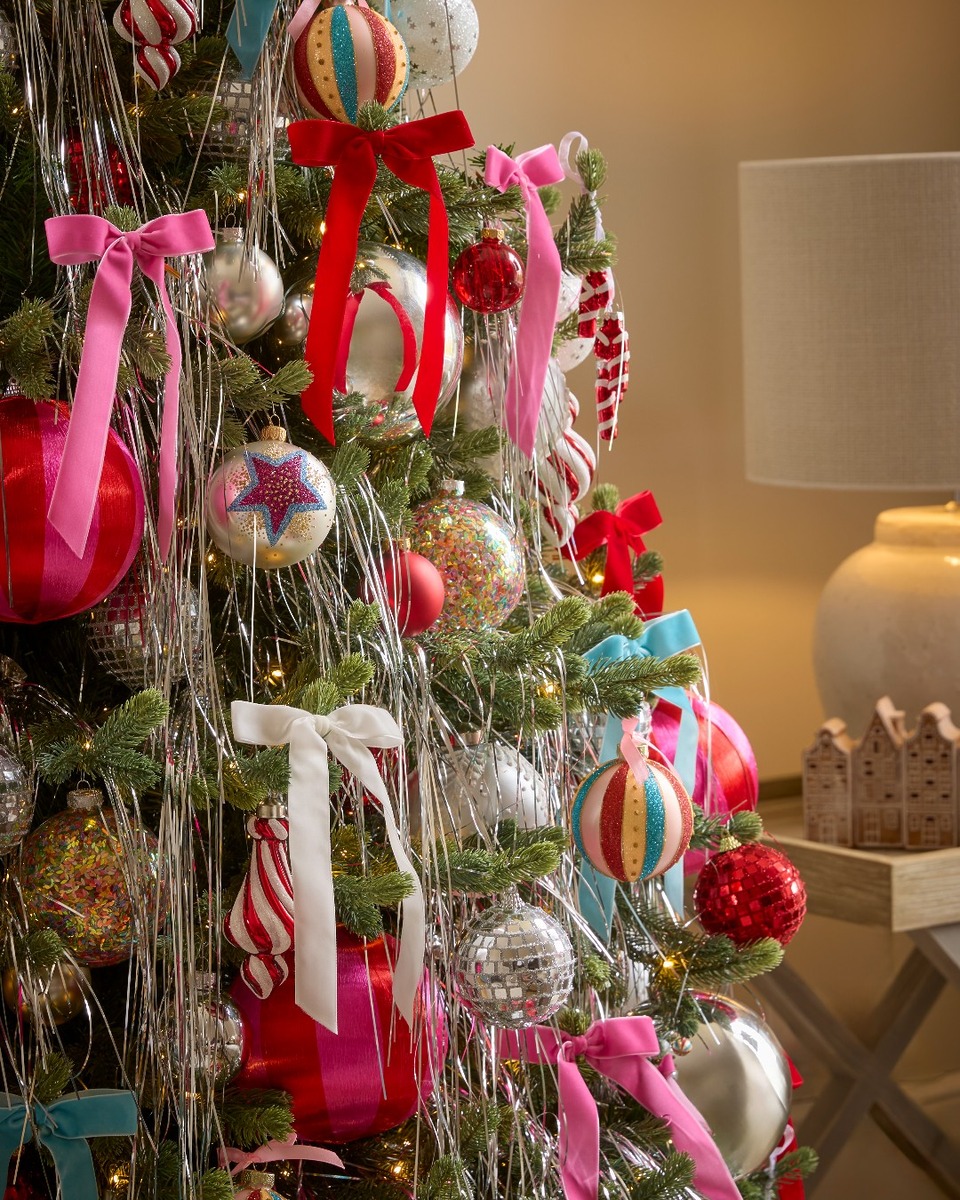 틴슬과 리본, 그리고 키치 포인트를 모두 버무린 맥시멀리즘 트리도 있습니다. 여러 소재가 믹싱 되어 있지만 실버 틴슬을 받아주는 메탈 소재의 오너먼트가 있고, 또 빨강과 핑크 컬러의 리본과 동일한 컬러 팔레트를 지닌 오너먼트 역시 디스플레이 되어 있어 산만하지 않아요.