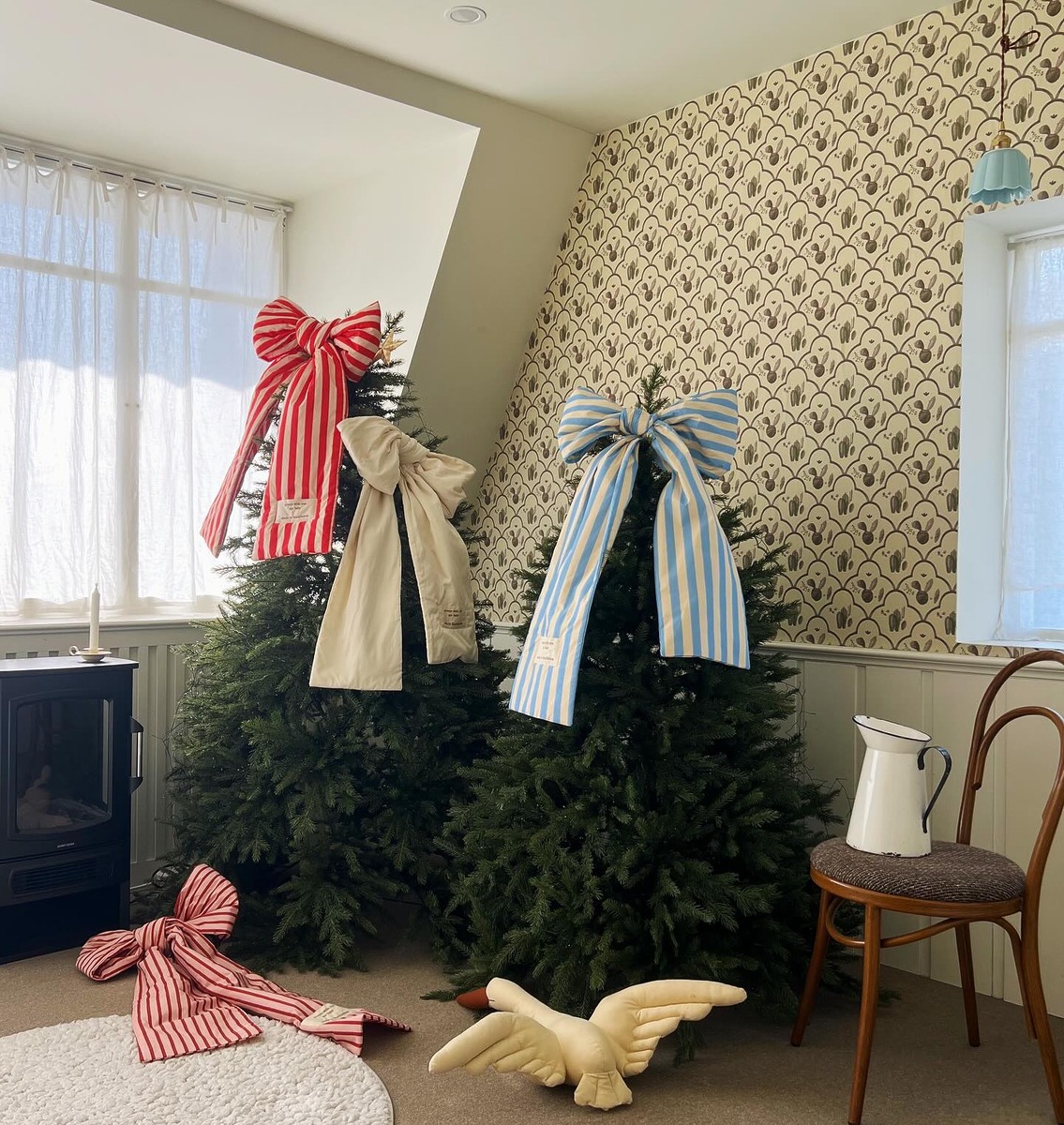 몇 년 전부터 크리스마스가 다가오면 카페나 레스토랑의 출입문, 또는 외벽에 커다란 빨간 리본을 다는 게 유행이었죠. 이 ‘빅 보우’ 트렌드가 이제 실내로 들어왔습니다. 클래식한 빨간 리본은 물론, 스트라이프와 깅엄체크, 그리고 벨벳 소재의 블랙 리본 등 다양한 컬러와 패턴, 소재의 리본이 트리의 꼭대기를 점령하고 있어요. 워낙 존재감이 커서 트리에 리본 하나만 달아줘도 부족한 느낌이 들지 않아요. 여기에 앵두 전구 정도만 추가해도 충분히 홀리데이 무드를 연출할 수 있습니다.