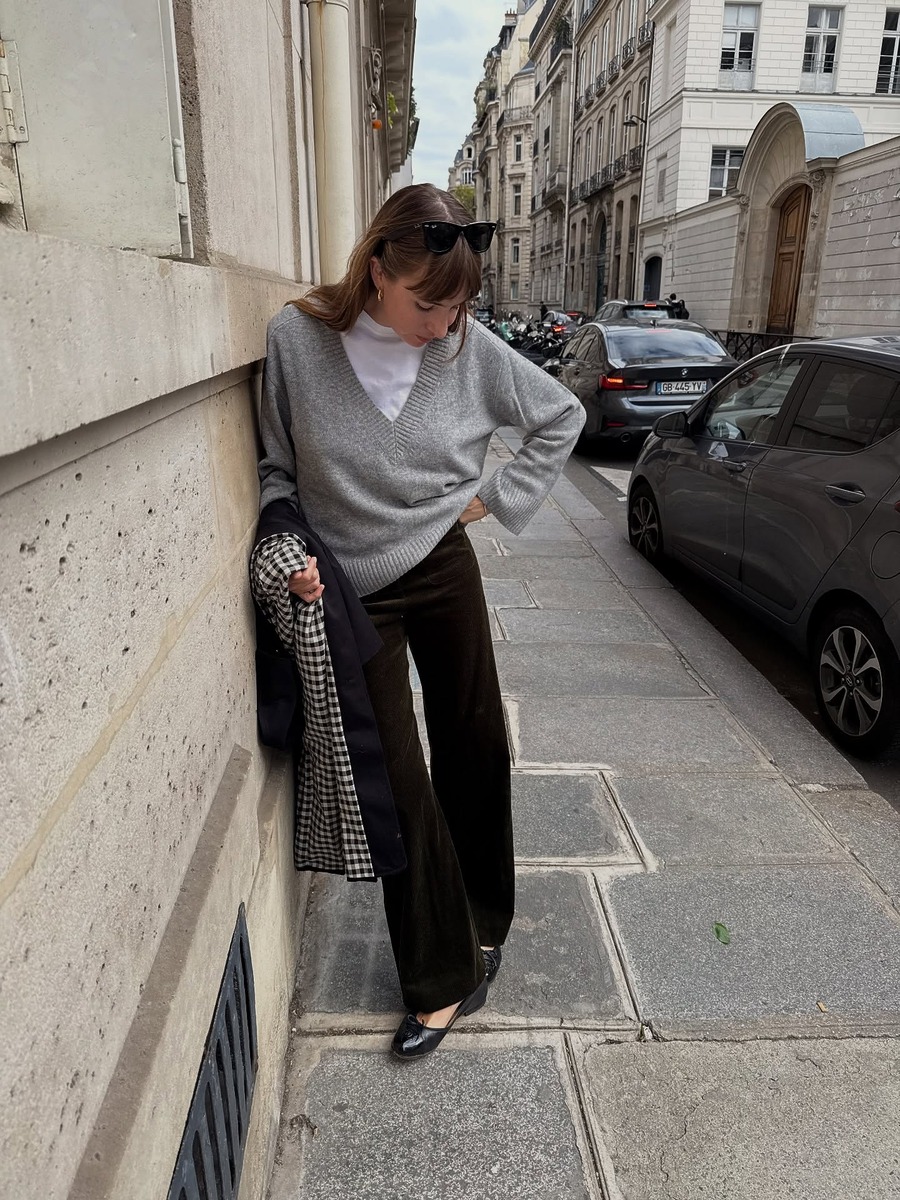 단독으로 입기엔 부담스러운 넥라인이 깊은 브이넥 니트도 화이트 티셔츠와 함께라면 안정적으로 연출할 수 있어요. 그레이 니트 안에 화이트 티셔츠를 받쳐 입고 브라운 벨벳 팬츠를 더하면 소재와 컬러가 부드럽게 어우러지죠. 여기에 무채색 깅엄 체크 코트를 레이어드하면 출근룩부터 데일리룩까지 폭넓게 활용할 수 있습니다.
