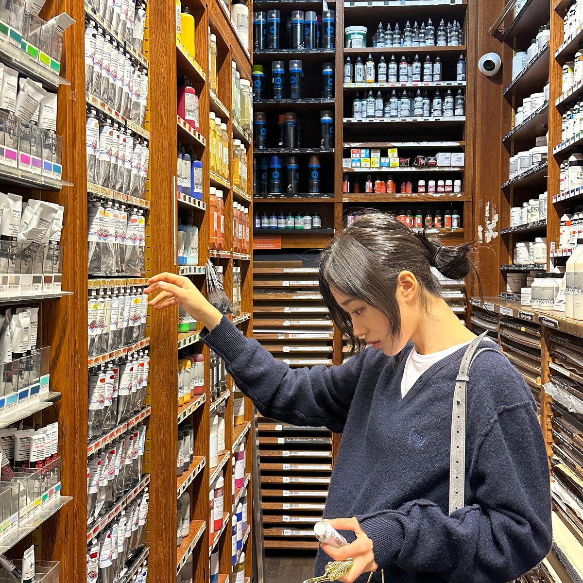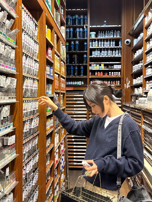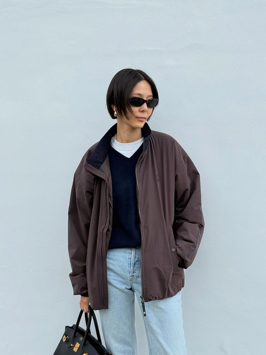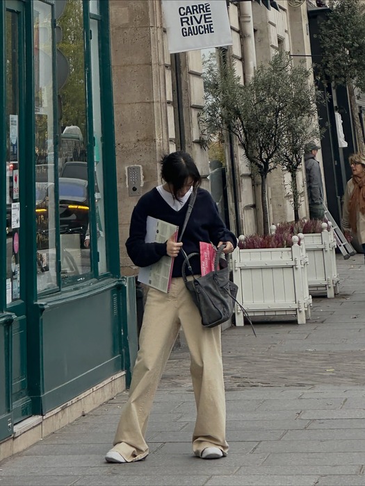 네이비 브이넥 니트와 화이트 티셔츠는 실패할 걱정 없는 안전한 조합입니다. 노윤서와 김나영처럼 넥라인 아래로 흰 티셔츠가 얇게 비치도록 레이어링 하면 미니멀한 실루엣이 또렷하게 살아나죠. 티셔츠와 니트의 대비 덕분에 네이비 톤이 더욱 깊어 보이고, 티셔츠 밑단을 깔끔하게 정리하면 정돈된 느낌을 줍니다. 여기에 볼드한 골드 이어링이나 목걸이를 더하면 단정한 룩에 세련된 포인트까지 더해져요.