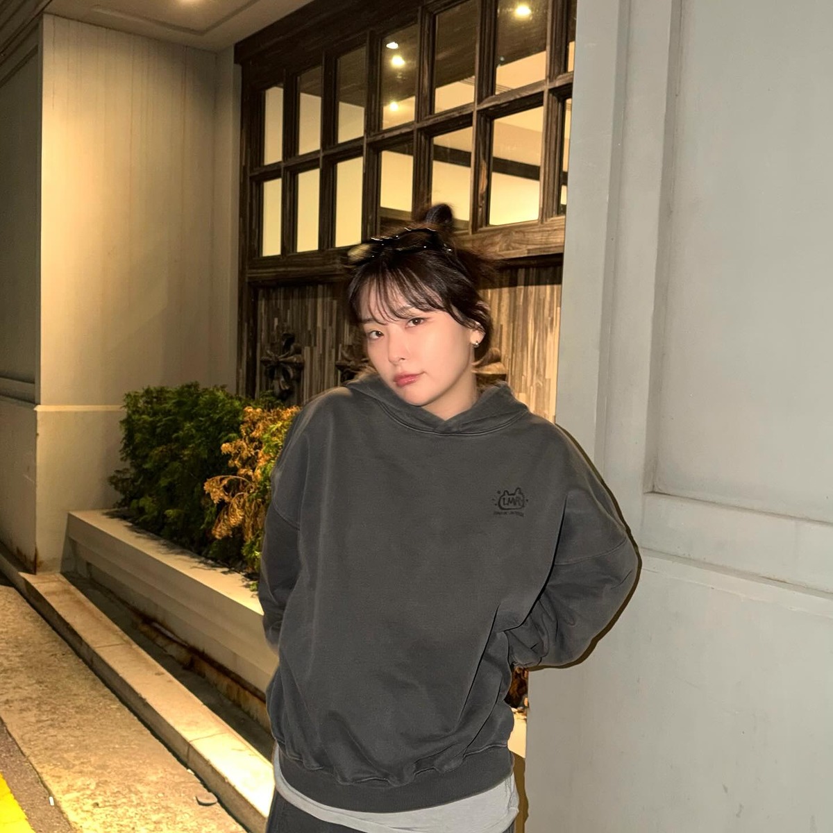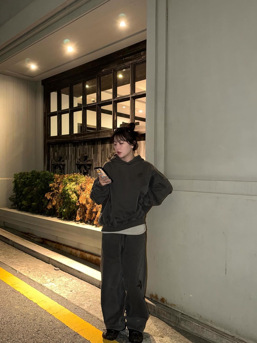 편안함과 스타일, 두 마리 토끼를 동시에 잡고 싶다면, 레드벨벳 슬기의 룩에서 힌트를 얻어 보세요. 차콜 컬러 셋업에 블랙 스니커즈를 매치해 편안한 데일리룩을 완성한 슬기. 후디 보다 한 톤 밝은 그레이 티셔츠를 레이어드해 실루엣에 리듬감을 더했습니다. 위아래 컬러가 같은 셋업은 자칫 심심해 보일 수 있어 주의가 필요합니다. 어두운 후디 밑은으로 밝은색 티셔츠가 살짝 보이게 연출하는 것만으로 훨씬 멋스러워 보일 거예요.
