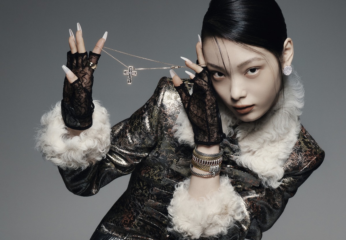 불규칙한 다이아몬드 파베 세팅이 달빛을 연상시키는 ‘사비아’ 이어링, ‘이코니카’ 밴드 링은 포멜라토(Pomellato). 영화 프레임에서 영감을 받은 ‘벨 에포크’ 네크리스는 다미아니(Damiani). 모두 손으로 늘여 착용하는 노베첸토 메시 디테일 브레이슬릿으로, (왼쪽부터) ‘에카 바이컬러 플렉스잇’, ‘방돔 플렉스잇’, ‘파노라마 플렉스잇’, ‘파노라마 플렉스잇’, ‘에카 플렉스잇’은 모두 포페(Fope). 재킷은 루이 비통(Louis Vuitton). 글러브는 발렌티노 가라바니(Valentino Garavani).