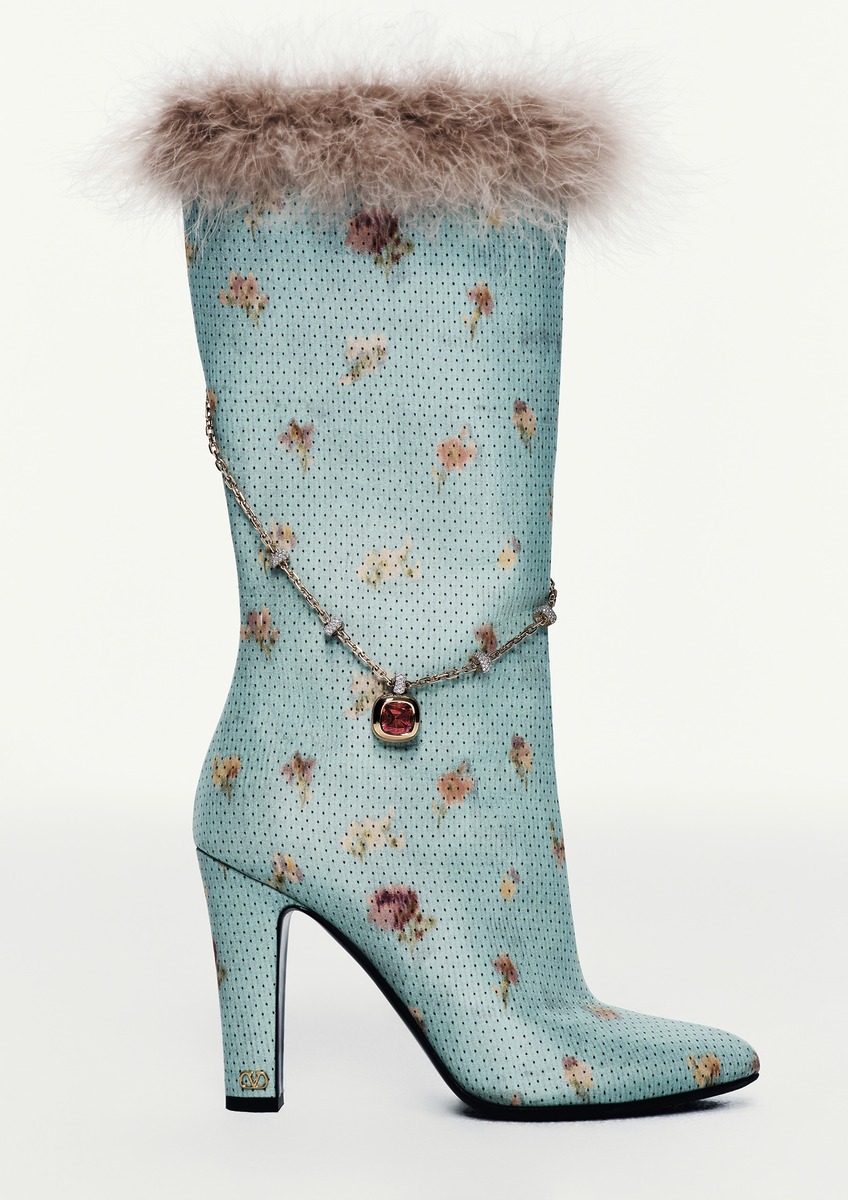 루벨라이트 펜던트를 장식한 로즈 골드 체인 링크의 ‘누도’ 하이 주얼리 네크리스는 포멜라토. 페더 장식을 더한 부츠는 발렌티노 가라바니.
