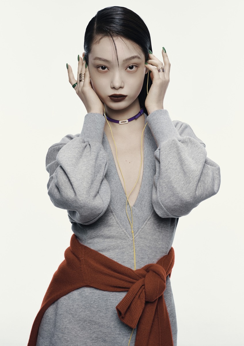 두바이에 대한 헌사로 나일 그린 컬러 래커 장식을 더한 ‘베르베르 크로마틱’ 링, 건축적 디자인이 돋보이는 ‘베르베르 3-로우’ 링과 ‘베르베르 2-로우’ 링, 담백한 토프 컬러 래커 장식을 매치한 ‘베르베르 크로마틱’ 링은 모두 레포시(Repossi). 초커로 연출한 ‘마이 무브’ 브레이슬릿은 메시카(Messika). 브이넥 미니드레스는 디 아티코(The Attico).