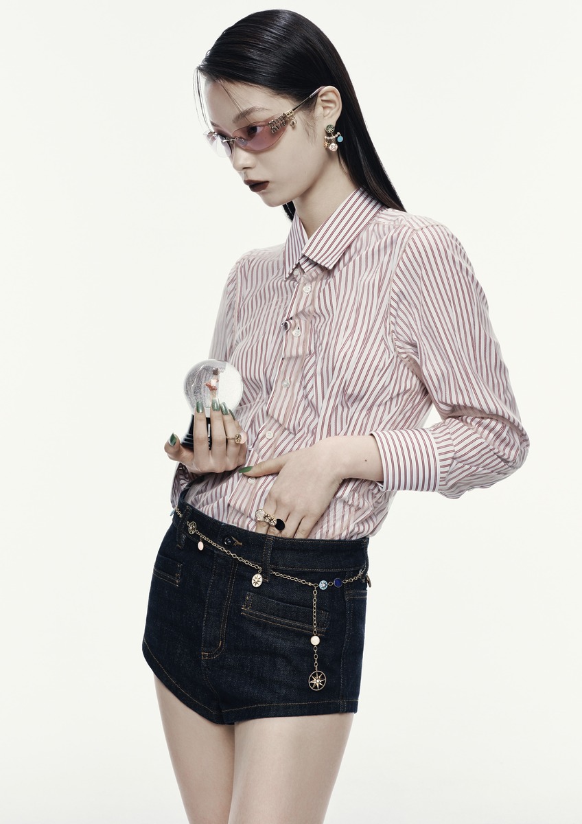 (위부터) 아이웨어에 매치한 클립온 스타일의 꿀벌 모티프 이어 커프와 럭키 참을 장식한 이어링 세트는 ‘로즈 드 방’ 언밸런스 참 이어링, 그랑빌의 빌라 레 럼 정원 모자이크에서 영감 받은 비대칭적 디자인의 ‘로즈 드 방’ 링 컬렉션, 말라카이트, 터쿼이즈, 라피스 라줄리 등 색색의 젬스톤에 장식한 ‘로즈 드 방 트랜스포머블’ 벨트는 모두 디올 파인주얼리(Dior Joaillerie). 셔츠는 메종 마르지엘라(Maison Margiela). 마이크로 데님 쇼츠는 셀프포트레이트(Self-Portrait). 핑크 틴트 아이웨어는 미우미우(Miu Miu).