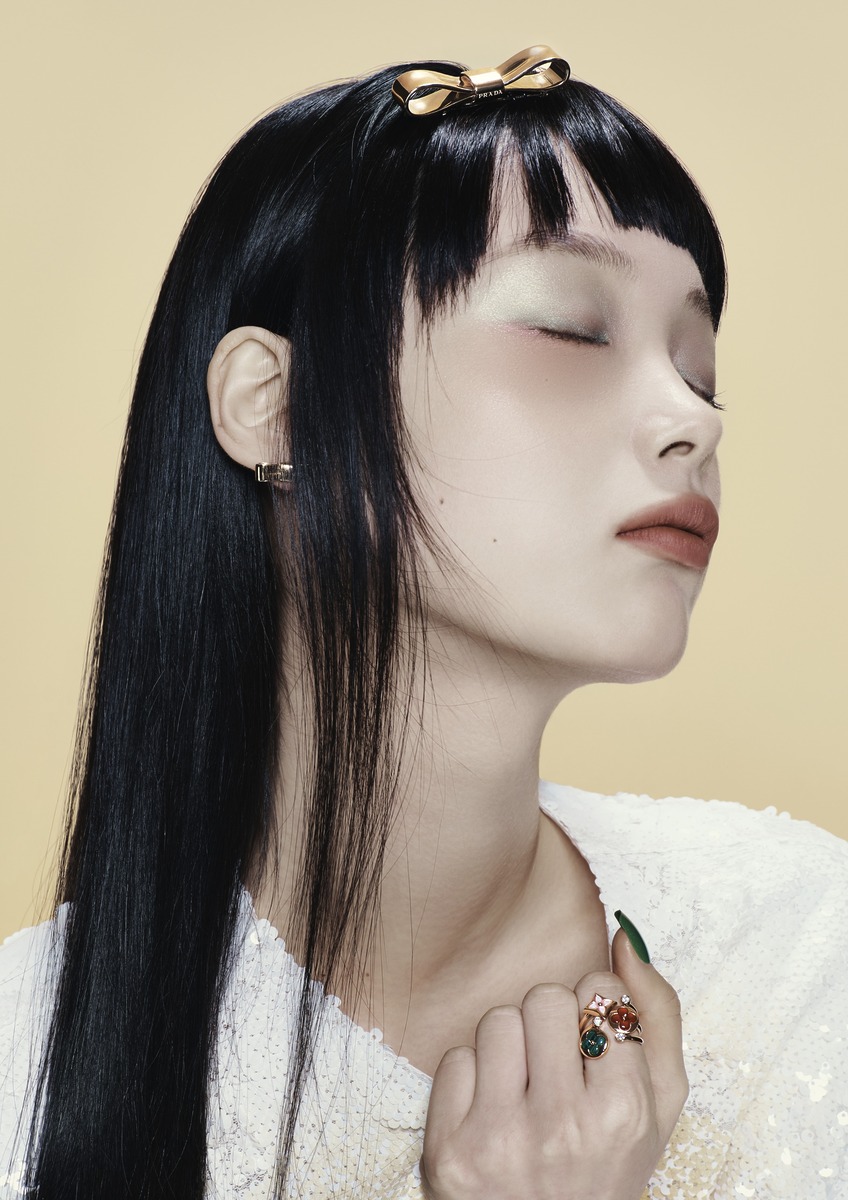 헤어 핀으로 연출한 리사이클 골드 소재의 ‘스몰 이터널 골드 리본’ 브로치, ‘이터널 골드 리본’ 이어링은 프라다 파인 주얼리(Prada Fine Jewelry). (위부터) 마더 오브 펄을 세팅한 ‘컬러 블라썸 미니 스타’ 링, 카넬리안을 세팅한 ‘컬러 블라썸 미니 썬’ 링, 말라카이트를 세팅한 ‘컬러 블라썸 미니 썬’ 링은 모두 루이 비통. 시퀸 소재 톱은 푸시버튼(Push Button).