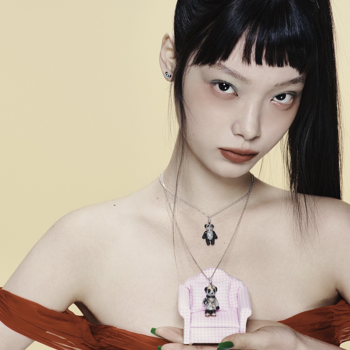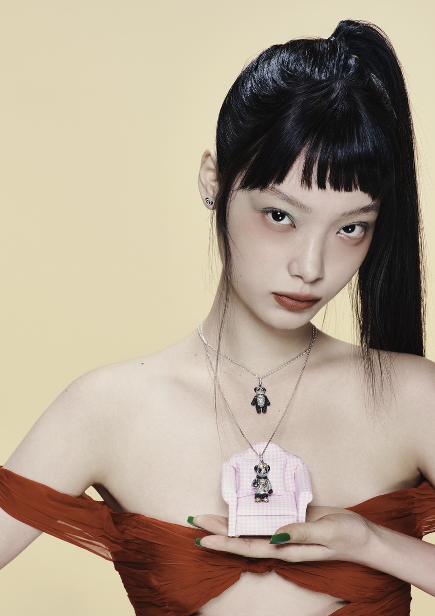 (위부터) 판다 모티프의 ‘쁘띠 보보’ 이어 스터드, 다이아몬드 풀 파베 세팅 ‘미디엄 보보’ 펜던트 네크리스, ‘라지 힙 보보’ 펜던트 네크리스는 모두 키린(Qeelin). 오프숄더 칵테일 드레스는 발렌티노(Valentino).