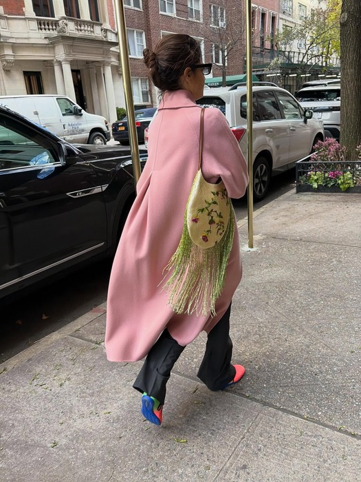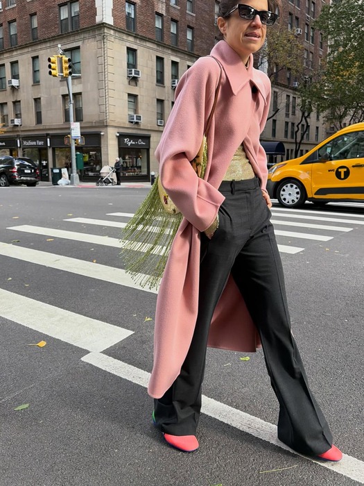 혹은 패션 인플루언서 리안드라 메딘처럼 골드 글리터 톱과 슬랙스에 버블검 핑크 컬러의 롱코트를 걸치면 과감하면서도 균형 잡힌 룩을 연출할 수 있습니다. 핑크가 주는 사랑스러움과 코트의 부드러운 소재감이 만나 우아하면서도 유니크한 룩이 완성됩니다.