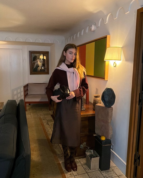 파스텔 핑크 니트는 겨울 룩의 부담스럽지 않은 포인트 역할을 합니다. 브라운 미니스커트와 함께 매치하면 따뜻하면서도 발랄한 인상을 줄 수 있어요. 때로는 니트를 입지 않고 어깨에 둘러 스타일링 포인트로 활용하는 것도 좋은 방법. 무채색 아우터가 많은 겨울엔 이런 파스텔 컬러가 하나 더해지는 것만으로도 룩 전체가 맑고 산뜻해 집니다.