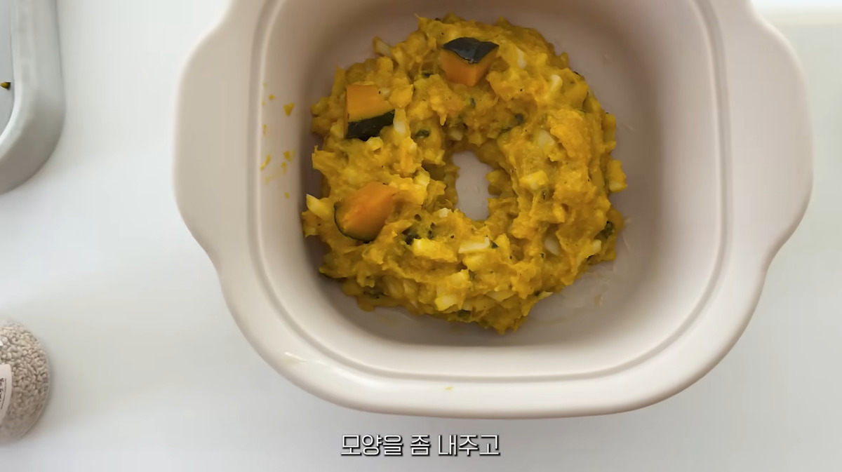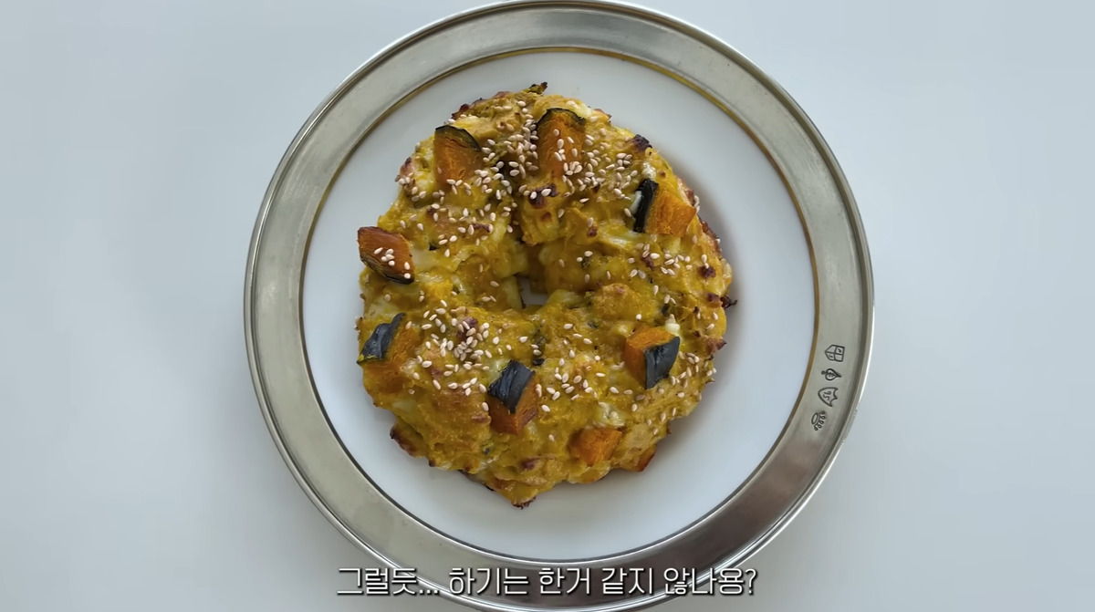 실리콘처럼 오븐이나 에어 프라이어에도 사용 가능한 소재로 제작된 용기 바닥에 올리브 유를 적당히 발라 줍니다. 그리고 만든 단호박 반죽을 베이글 모양으로 넣어 주세요. 이 위에 통깨, 그리고 아까 썰어 놓은 단호박 중 소량이 남았다면 함께 올려줘도 좋습니다. 그리고 오븐 또는 에어프라이어에 180도, 15분으로 구워주면 너무 간단하고 맛있는 단호박 베이글이 완성됩니다.