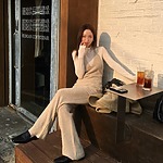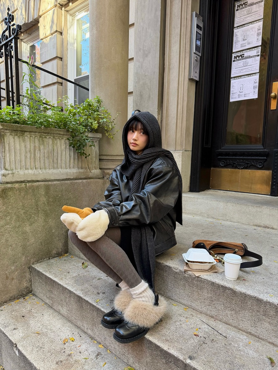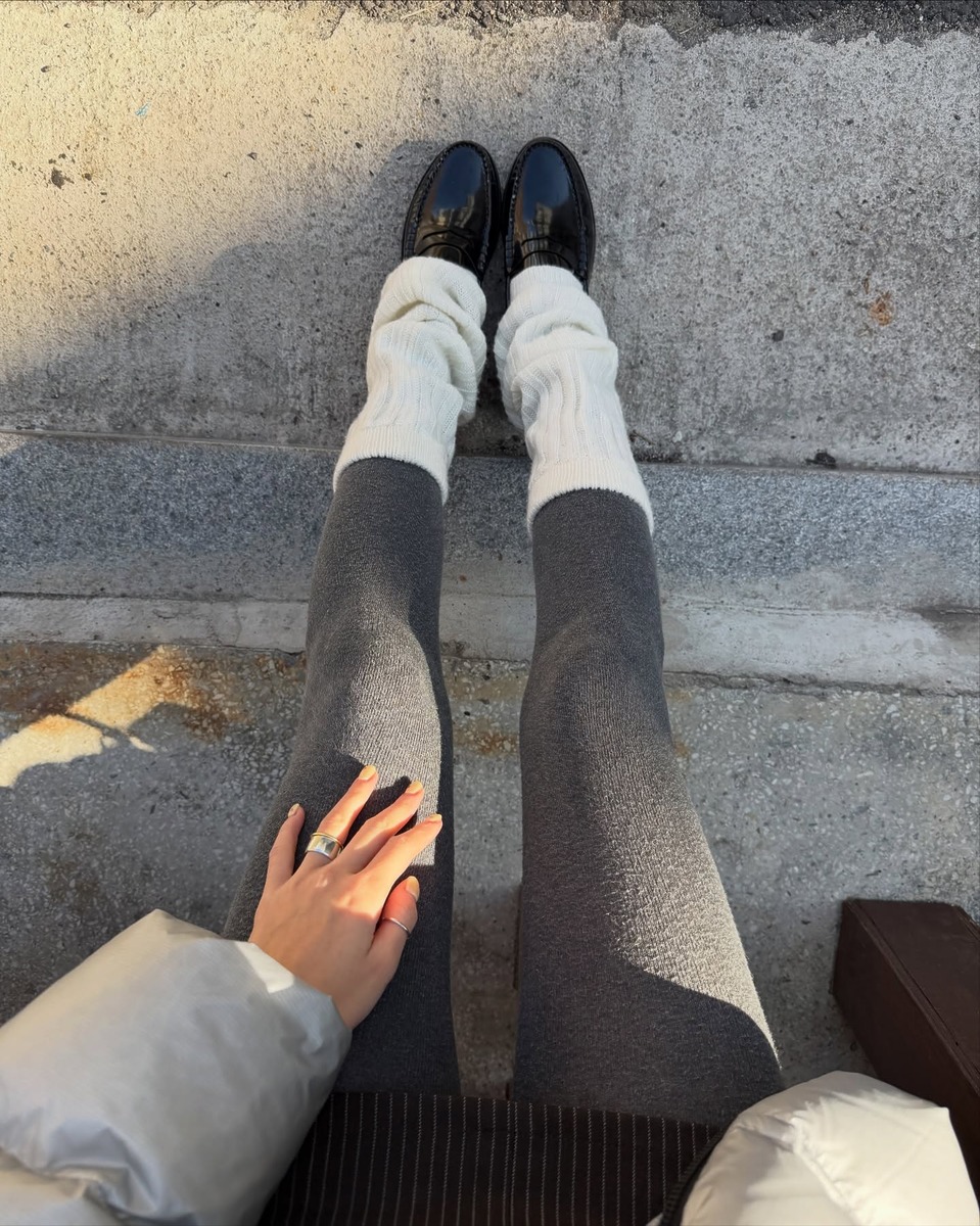 인플루언서 잉화는 도톰한 니트 레그워머와 회색 스타킹을 함께 매치했는데요, 여기에 굽이 있는 로퍼를 더해 발랄한 스쿨걸 룩을 완성했습니다.