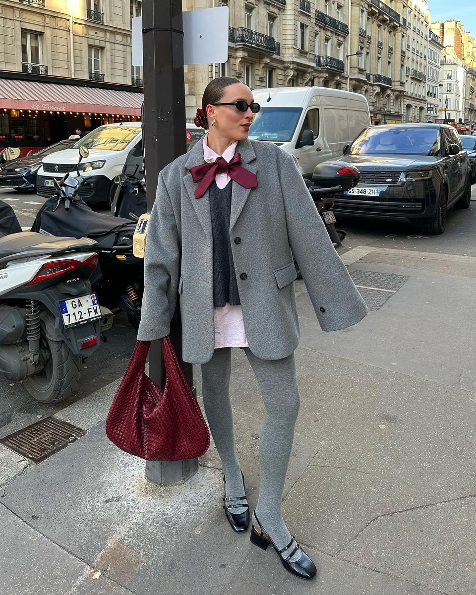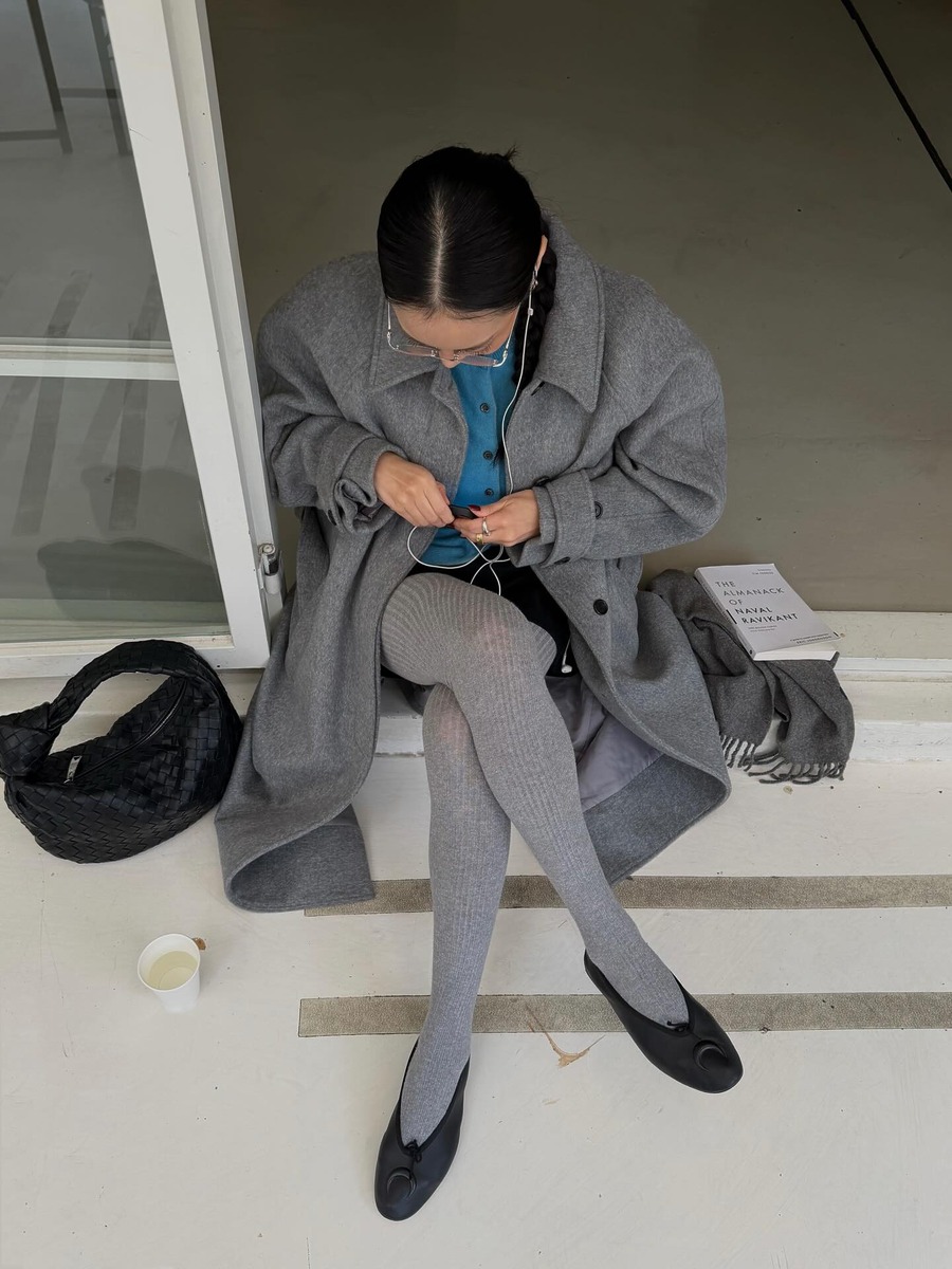 진리의 블랙 & 화이트! 하지만 추운 겨울에는 블랙과 화이트처럼 대비가 큰 조합은 자칫 추워 보일 수 있습니다. 이럴 때 둘 사이를 아주 부드럽고 자연스럽게 연결해 줄 아이템이 바로 회색이죠. 특히 타이츠는 벌키 한 아우터와 짧은 하의, 그리고 슈즈와의 간극 사이를 물 흐르듯 메워 줍니다. 핀터레스트 속 언니들처럼 세련되고 감도 있는 겨울 룩을 완성하고 싶다면 회색 스타킹을 잊지 마세요!
