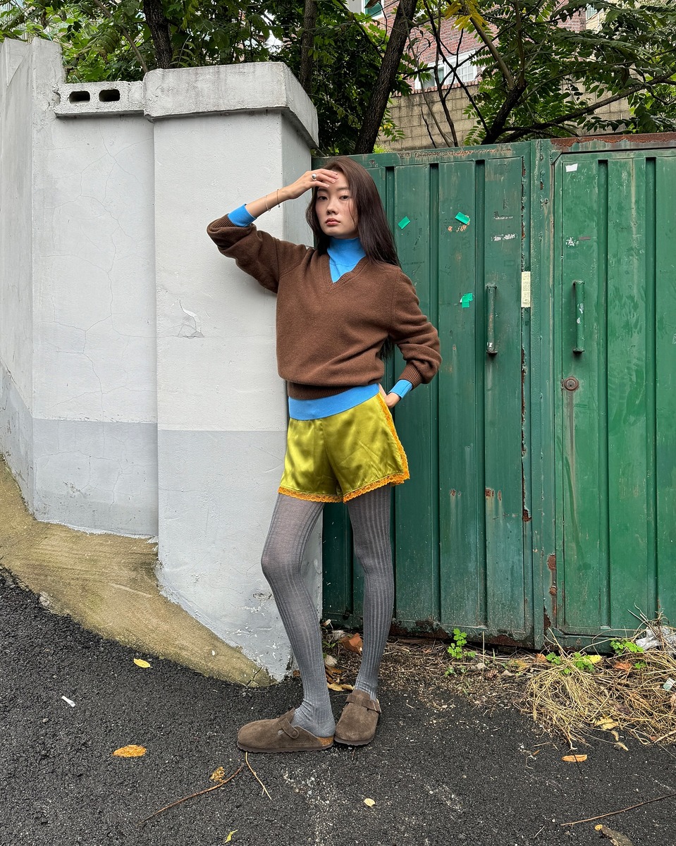 컬러 조합에 자신이 있는 이들이라면 민주의 과감한 색 조합을 참고해 보는 건 어떨까요? 아주 쨍한 블루 터틀넥 위에 브라운 컬러의 브이넥을 더해준 뒤 올리브색의 새틴 팬츠까지! 이렇게 자기 주장이 강한 컬러들에 회색 타이츠를 더해 통일감과 계절감을 부여했어요.