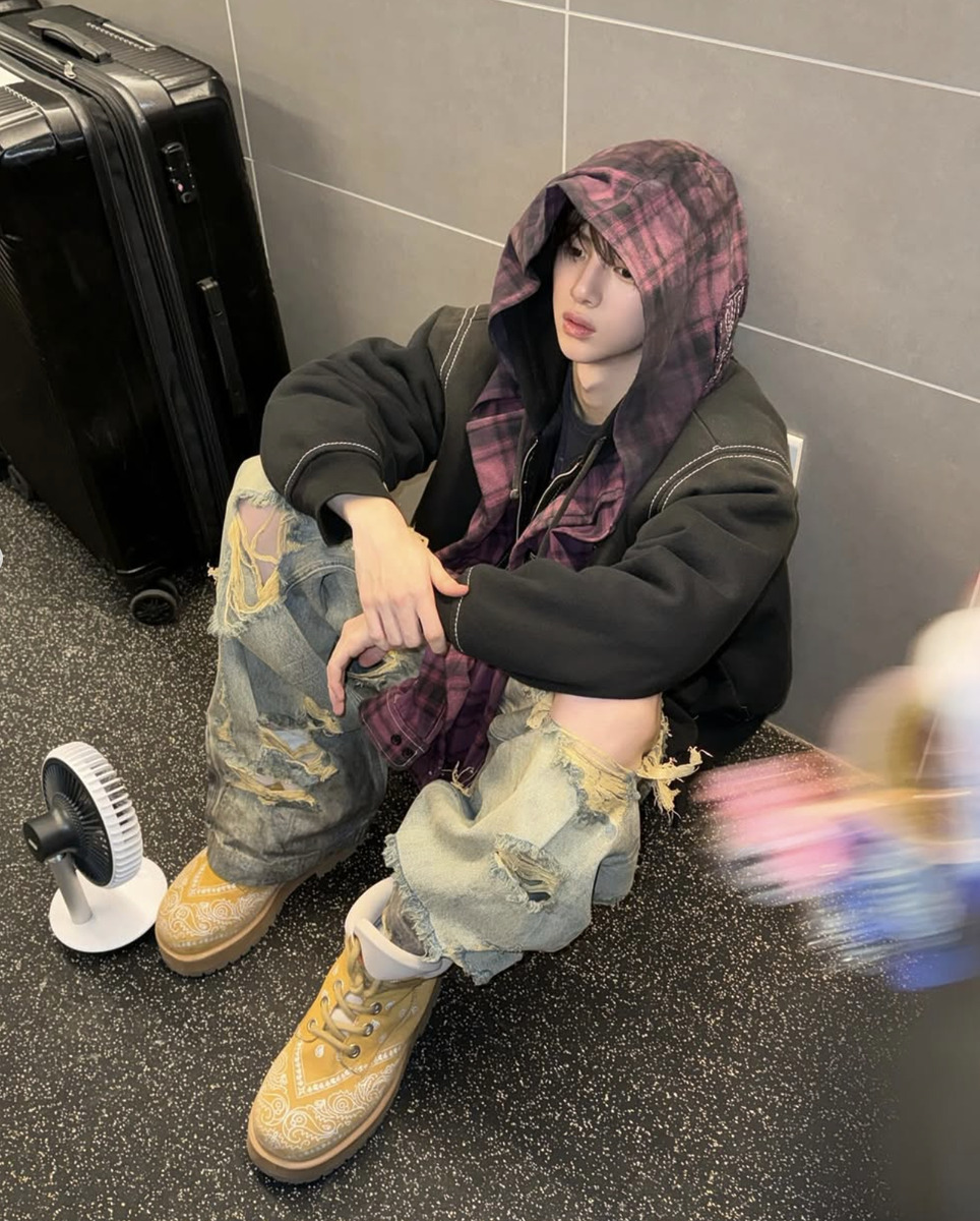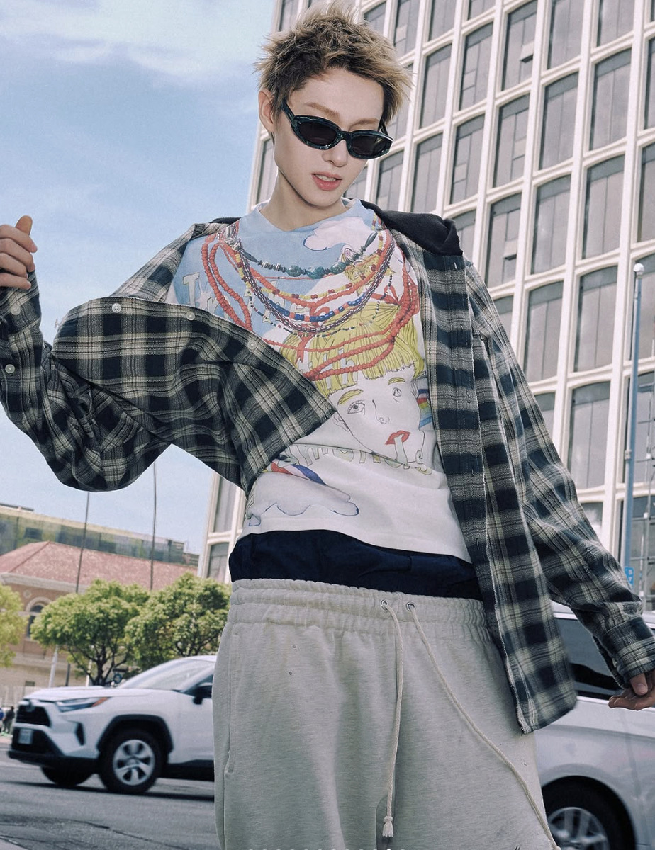긴팔 위에 반팔을 겹쳐 입는 Y2K 레이어드 트렌드가 돌아왔어요. 일명 ‘쭉티’라 불리던 무지 티 위에 빈티지 반팔을 겹쳐 입는 거죠. 특히 화려한 프린트가 돋보이는 밴드 투어 티셔츠에서 코르티스 멤버들이 얼마나 빈티지를 사랑하는지 느낄 수 있죠.