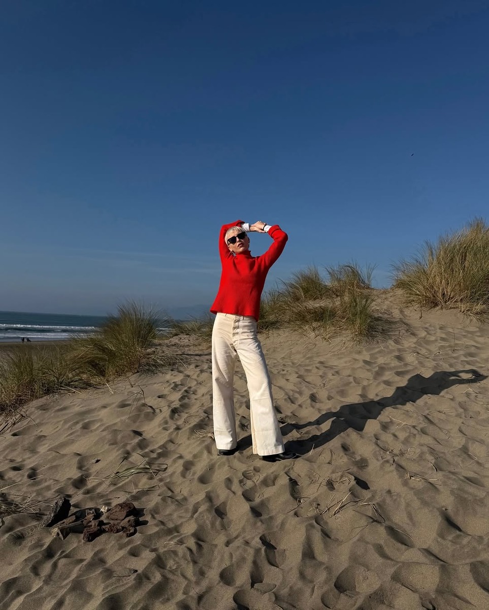 레드 아우터 또는 레드 스웨터를 매칭할 때는 데님 혹은 화이트 팬츠를 입어 캐주얼하게 연출해보세요. 컬러와 아이템의 조합이 단정해서 세련된 분위기를 연출할 수 있어요.
