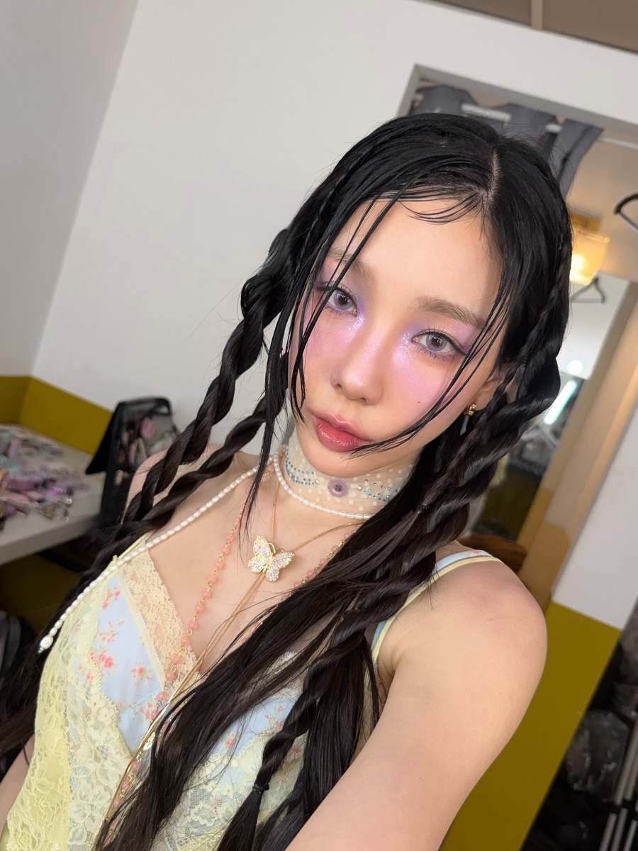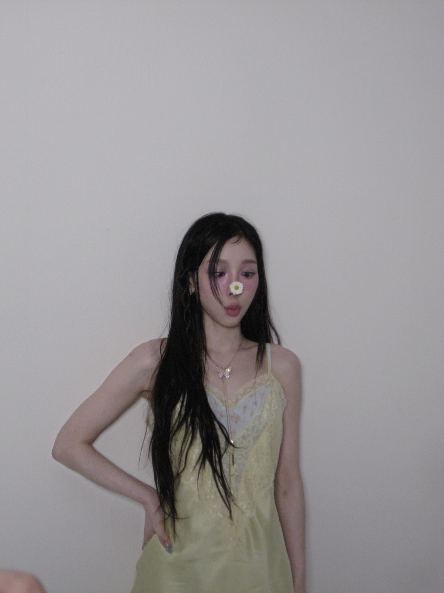 태연 역시 파스텔톤 레이스 드레스를 선택했어요. 파스텔 옐로 레이스에 플로럴 패턴이 더해져 레이스 본연의 사랑스러움을 극대화합니다. 파스텔 컬러가 레이스의의 섹슈얼한 무드를 살짝 눌러 주어 레이스도 부담 없이 소화할 수 있죠. 태연은 여기에 파스텔 핑크 액세서리를 더해 조화로운 무드를 완성했어요. 색감은 부드러우면서도 디테일은 풍부해, 과하지 않으면서 충분히 드레스 업된 느낌을 줄 수 있는 스타일입니다. 아우터로는 파스텔 그린 컬러의 퍼 재킷을 걸쳐주면 사랑스러운 파티룩이 완성될 거예요.