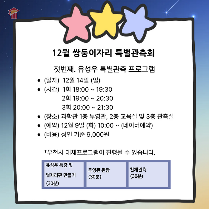 강화천문과학관에서도 13~14일 양일간 쌍둥이자리 유성우 관측 프로그램을 운영합니다. 관측회는 초저녁부터 새벽까지 이어지며, 별자리가 잘 보이는 시골 하늘 아래에서 유성우를 즐기기 좋은 기회입니다. 도심의 인공조명이 없는 곳이라 별이 훨씬 생생하게 볼 수 있는 것이 장점이죠. 유성우 특강과 별자리판 만들 등 다양한 체험 프로그램도 준비되어 있으니, 놓치지 마세요.