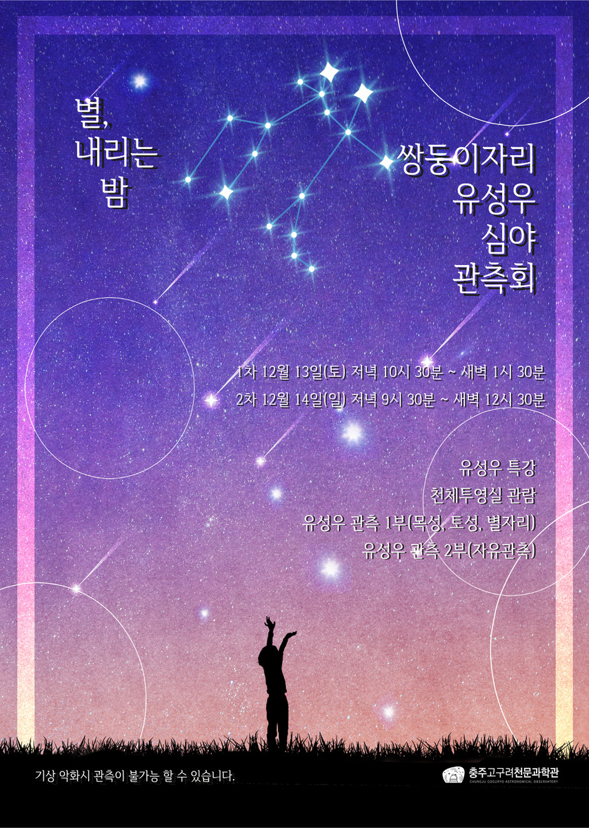 관측 시간: 12월 13일 밤 ~ 14일 새벽, 밤 9시 이후. *자정~새벽 2시가 가장 활발해요.