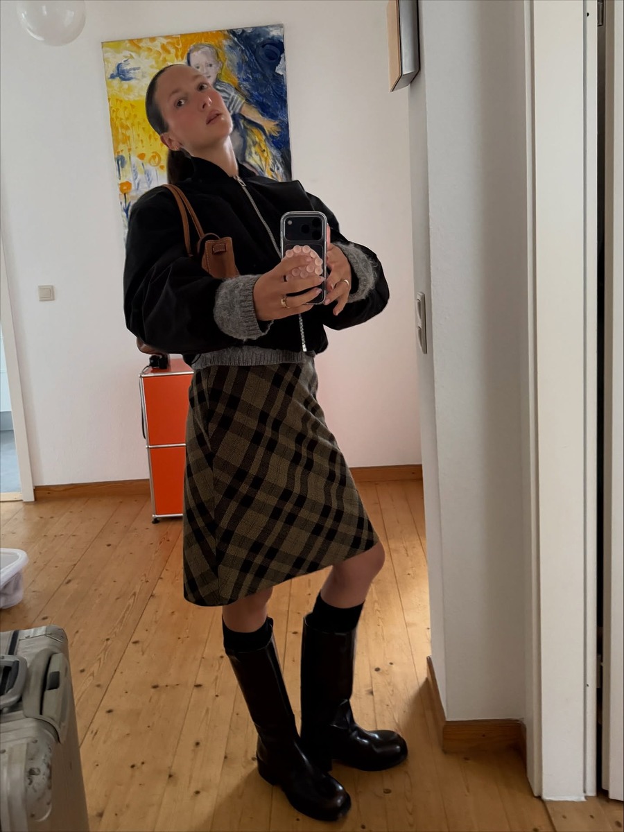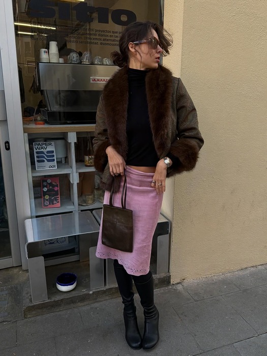 올여름 수많은 패션 피플의 사랑을 한 몸에 받은 미디 스커트. 무릎까지 오는 미디 스커트는 자칫 애매해 보일 수 있지만, 롱부츠와 매치하는 순간 클래식한 90년대 무드가 한껏 살아납니다. 하의에 시선이 집중될 수 있도록 재킷은 짧은 기장으로 선택해 실루엣을 정리해 주면 우아함이 배가 되죠. 밋밋한 무채색 스커트보다는 패턴이나 컬러 포인트가 있는 스커트로 겨울 패션에 생기를 더해 보는 것도 좋은 방법입니다. 여기에 니삭스나 스타킹까지 더해주면 보온성과 스타일을 모두 챙긴 겨울 데일리룩이 완성되니, 한파도 걱정 없죠.