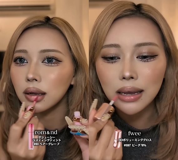키쨩은 롬앤의 더 쥬시 더 래스팅 틴트의 가장 대표적인 컬러인 베어 그레이프와 퓌의 3D 볼류밍 틴트 피치 70%를 더해 잘 구워진 치크와 어울리는 유리알 광택 립을 완성했습니다. 롬앤이 이번 여름에 선보인 피치 크림 베이지 빛 색상인 크림쉘도 갸루 메이크업에 활용하기 좋아요.