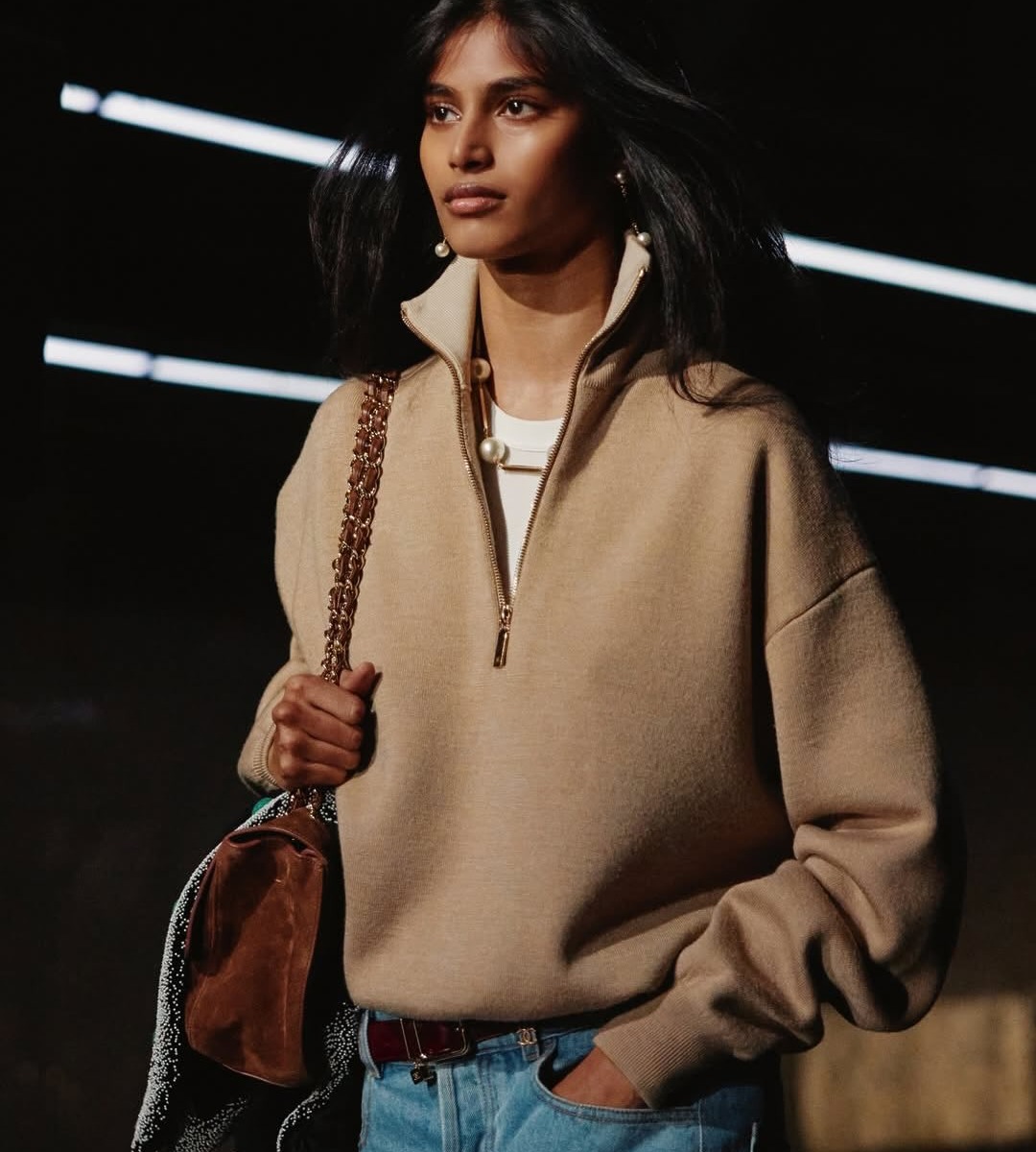 이 흐름에 결정타를 날린 건 마티유 블라지의 첫 샤넬 2026 공방 컬렉션이었습니다. 카멜 컬러 쿼터 집업에 데님 팬츠를 매치한 모델이 오프닝을 장식하며 전 세계 패션 피플의 시선을 사로잡았죠. 샤넬뿐 아니라 로에베, 디올, 미우미우 등 여러 패션 하우스의 런웨이에도 쿼터 집업이 잇달아 등장했습니다. 정제된 실루엣과 캐주얼한 여유가 공존하는 특유의 매력으로 패션계를 빠르게 사로잡으며, 쿼터 집업은 이번 시즌 키 아이템으로 급부상했습니다. 그렇다면 누구보다 트렌드에 민감한 셀럽들은 쿼터 집업을 어떻게 활용하고 있을까요?