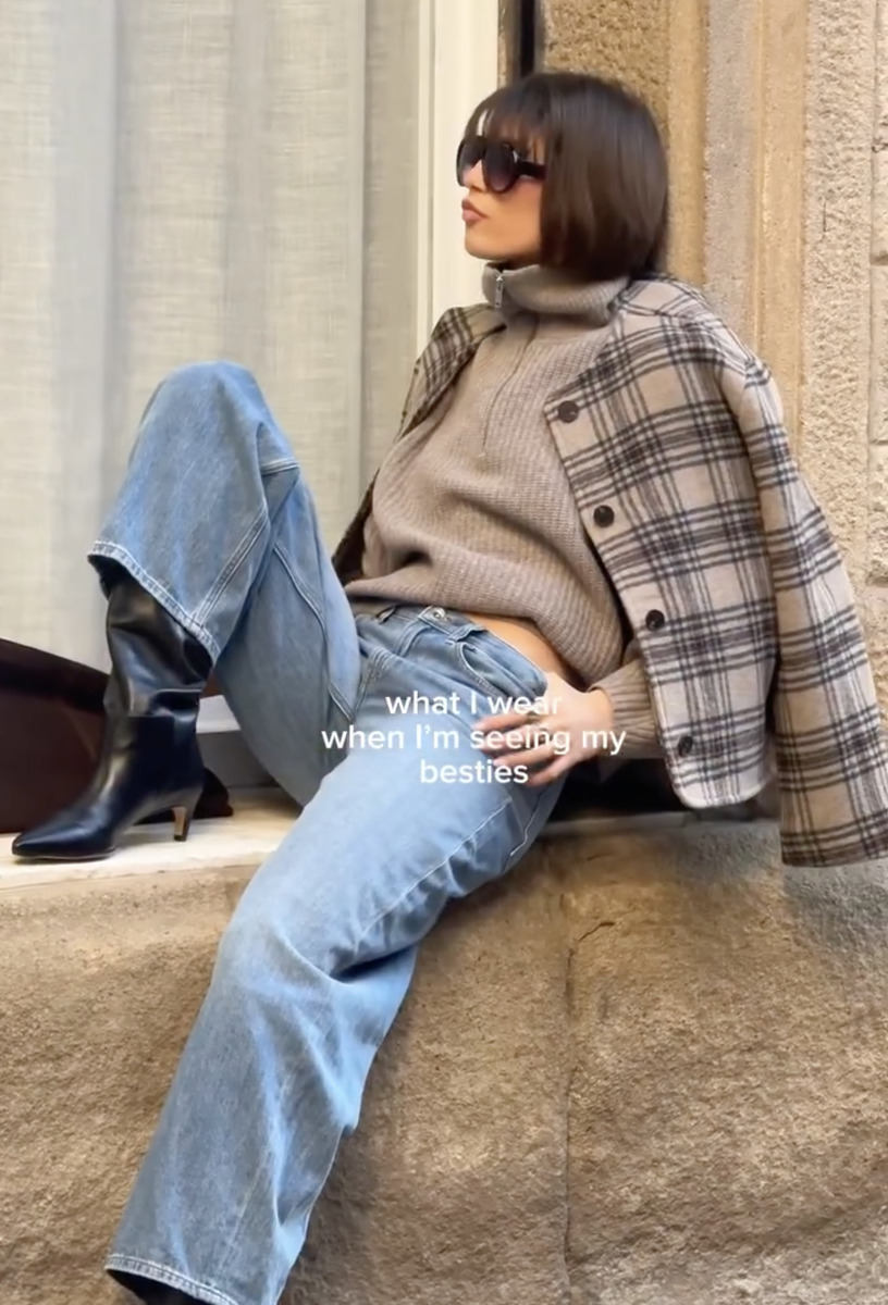 브라운 쿼터 집업은 데님부터 슬랙스까지 어떤 팬츠와도 잘 어울려 하나쯤 있으면 겨울 내내 유용하게 활용할 수 있어요. 사나는 베이지 컬러의 케이블 쿼터 집업으로 클래식한 무드를 강조했습니다. 니트의 조직감 덕분에 훨씬 고급스러워 보이고, 카멜 베이지 컬러가 얼굴 톤까지 정리해 주죠. 아우터로는 쿼터 집업과 같은 브라운톤의 체크 재킷을 레이어드하거나 블랙 롱코트와 함께 매치하면 출근룩으로도 제격이랍니다.