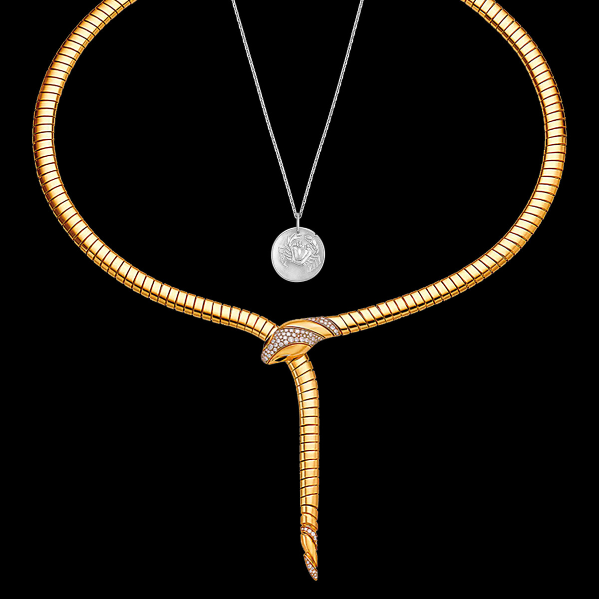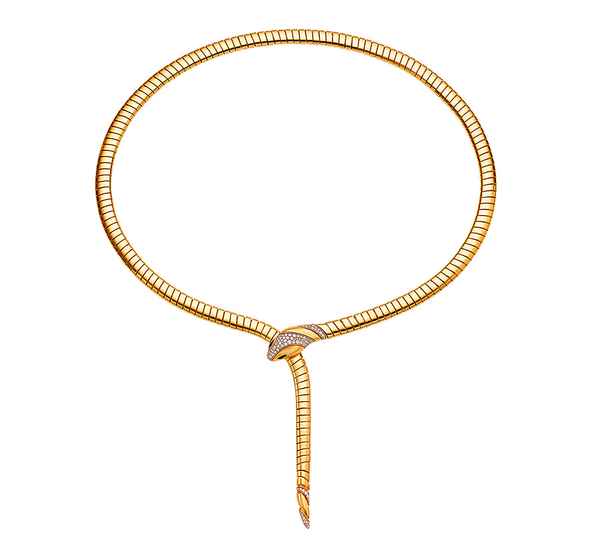 볼드한 실루엣에 다이아몬드를 파베 세팅한 옐로 골드 ‘세르펜티 바이퍼’ 네크리스는 가격미정 불가리(Bvlgari).