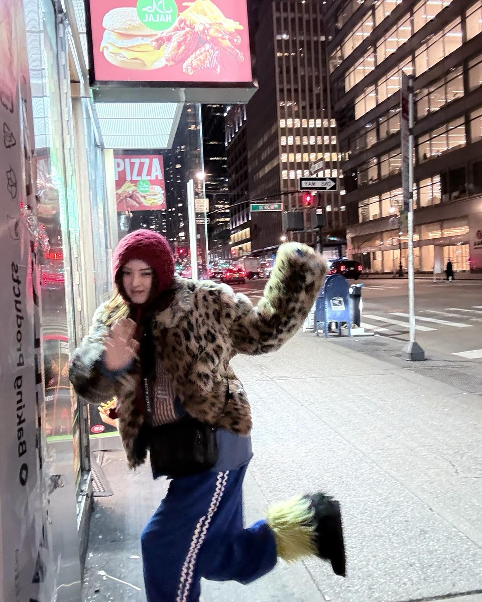 레오파드 아이템을 상의, 하의, 아우터까지 갖고 있는 호피 애호가인가요? 그렇다면 이번 겨울, 한소희의 뉴욕 여행 패션을 본보기 삼아 호피를 즐겨보기를 권합니다. 레드 바라클라바에 블루 트레이닝 팬츠에 레오파드 퍼 재킷, 보라색 실크 셔츠에 빨간 볼캡과 암워머에 레오파드 팬츠. 프린트와 소재와 아이템을 마구 섞는 거예요. 호랑이 기운이 솟아나는 스타일링, 참 쉽죠?