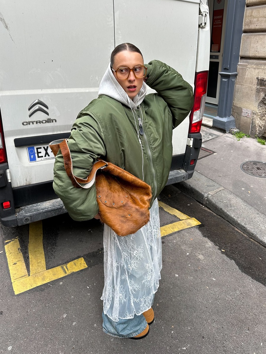 라라는 후드 티셔츠와 함께 매치해 봄버 재킷 특유의 캐주얼함을 잘 살린 동시에 레이스 원피스를 믹스 매치하는 센스를 보여줬어요. 레이스 원피스나 스커트 레이어드에 도전해 보고 싶었지만 왠지 너무 로맨틱한 무드로 연출될까 고민되었다면 이런 믹스 매치를 참고해도 좋습니다.