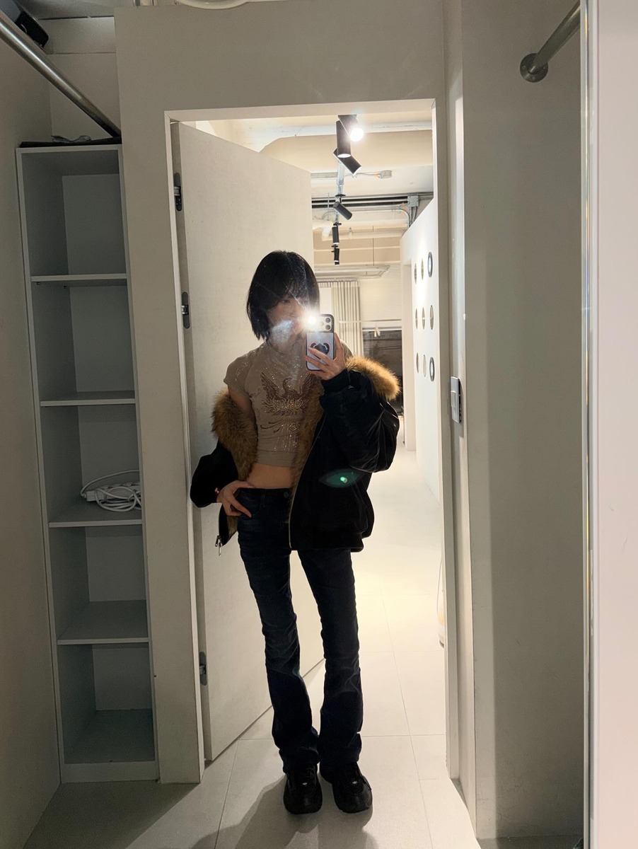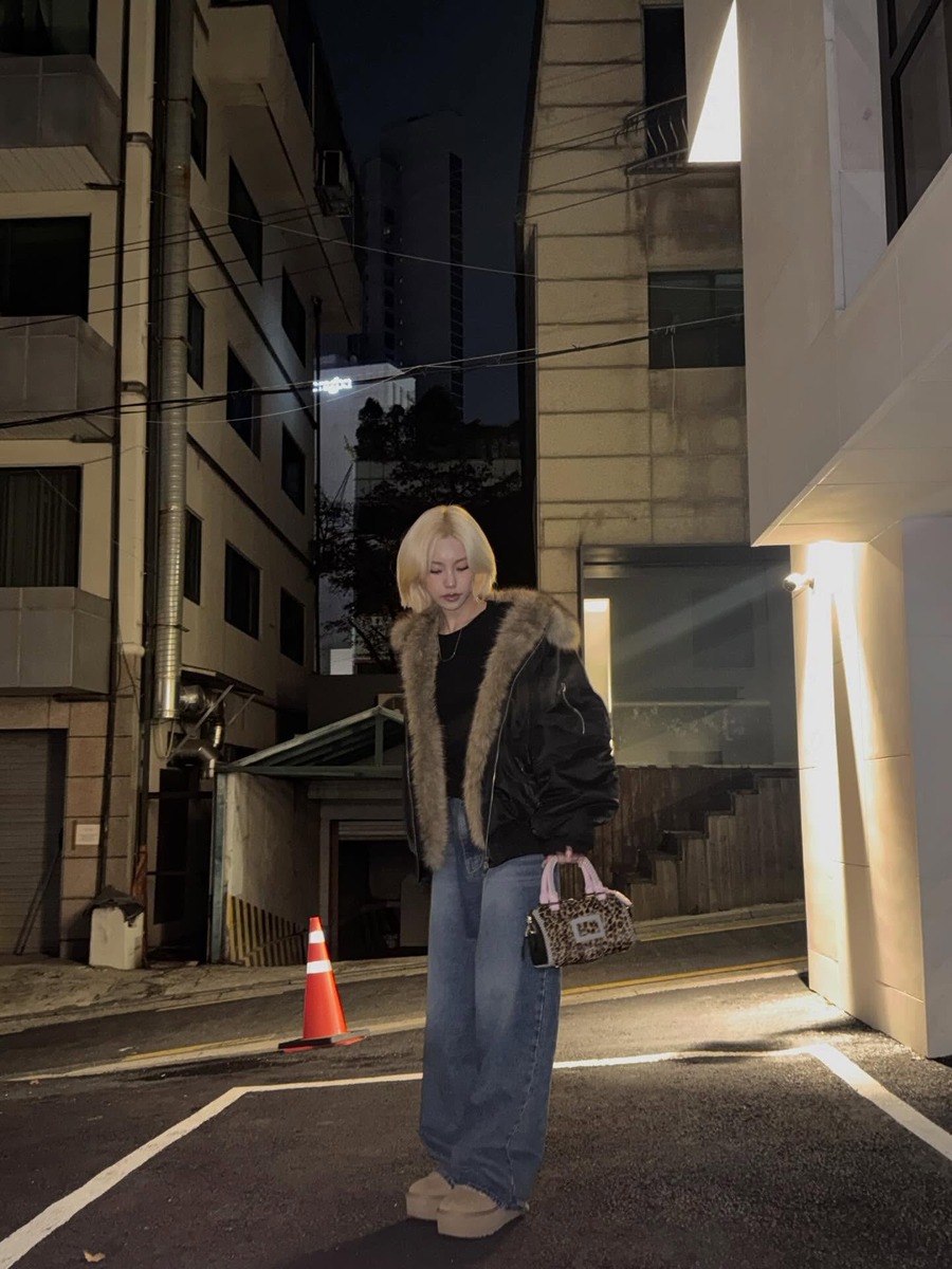 애니는 블랙 컬러의 봄버를 스트레이트 핏 데님과 함께 매치했습니다. 부츠 안에 자연스럽게 바지를 구겨 넣어 위는 넉넉하게, 종아리 아래는 슬림 하게 핏을 연출해 쿨함을 더욱 강조했어요.