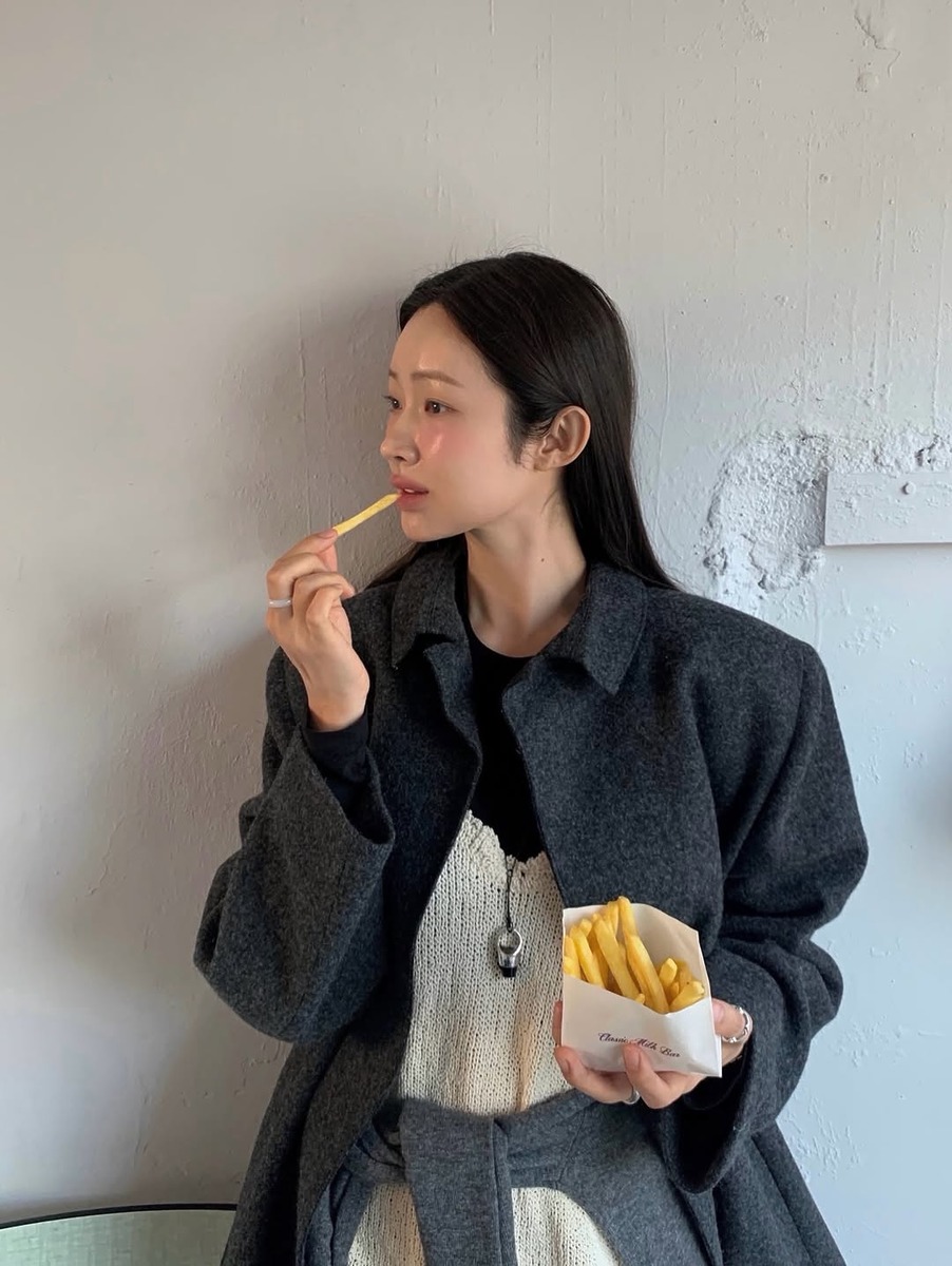 만약 웜톤이 꼭 블랙 아우터를 입어야 한다면 안에 피치, 살구, 크림, 웜 베이지 등 본인의 베스트 컬러 니트를 입어보세요. 블랙의 차가운 기운이 얼굴에 직접 닿지 않도록 중간에서 완충 작용을 해주어, 안색이 칙칙해지지 않고 화사하게 살아나요.