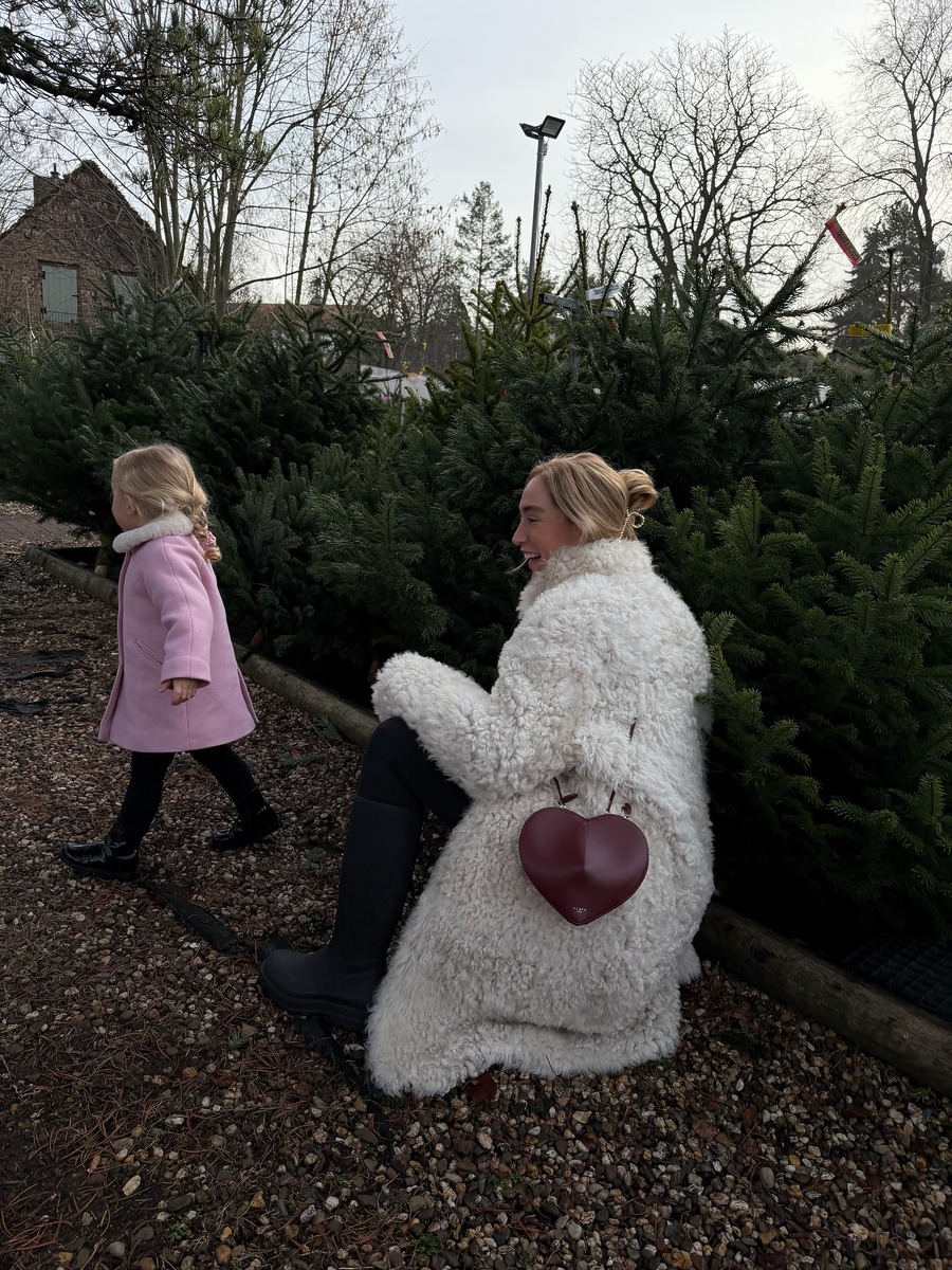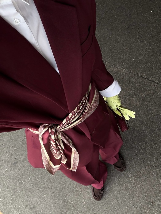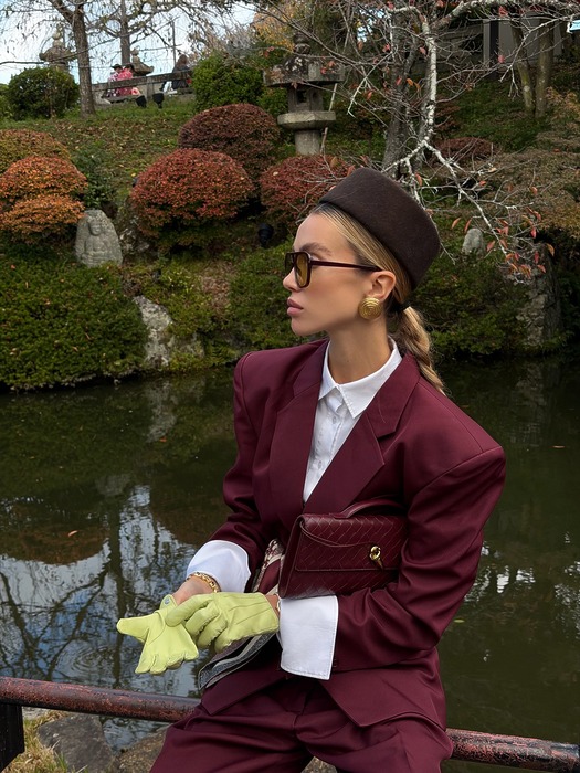 화이트나 아이보리, 크림 등의 밝고 부드러운 컬러를 좀 더 어른스럽게 소화하고 싶을 때에도 버건디를 활용해 주면 좋습니다. 사샤는 화이트와 버건디 조합을 선보이면서 동시에 버건디와 그린 계열의 장갑을 더해 적색과 녹색 계열 컬러 대비를 이용해 스타일링을 더욱 풍성하게 만들었어요. 컬러 매치에 자신 있는 이들이라면 이런 보색 대비도 시도해 보세요!