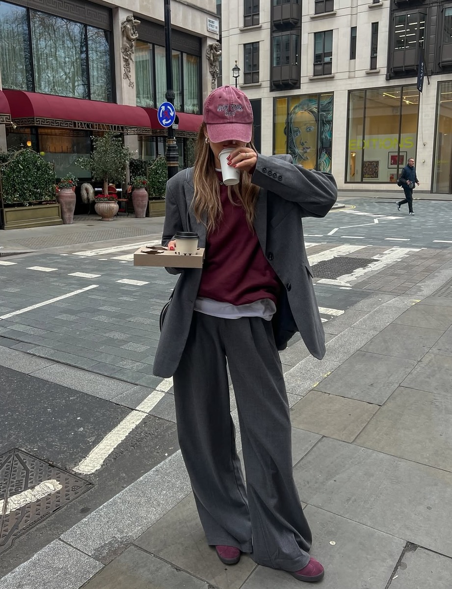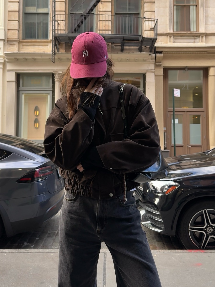 크리스티나는 아주 짙은 브라운 재킷에 검은색 데님 등 전체적으로 어두운 컬러 스타일링에 버건디 캡을 더해 분위기를 확 바꿔주었습니다. 만약 모자가 없었더라면 조금은 허전함이 느껴지는 코디였을 거예요.