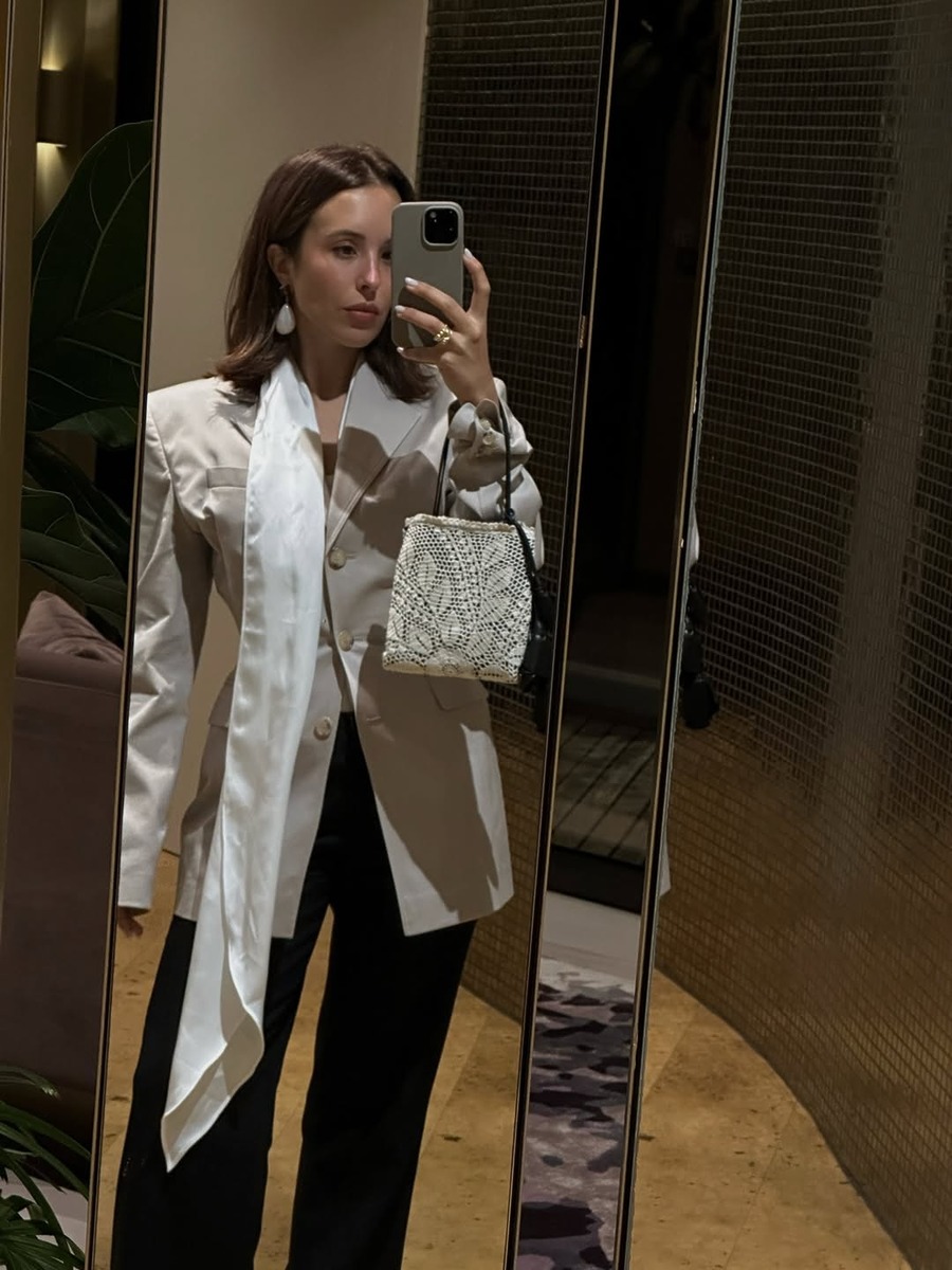 옷의 면적이 넓고 질감이 강할 때 작고 가느다란 귀걸이를 하면, 시각적으로 귀걸이가 옷에 ‘먹혀버리는’ 현상이 발생할 수 있어요. 또 얼굴도 커 보일 수 있죠. 입체적인 조형미가 있는 볼드 귀걸이는 옷의 무게감과 대등하게 맞서며 시선의 균형을 잡아줘요. 옷이 무거울수록 귀걸이도 어느 정도 힘이 있어야 전체적인 룩에 안정감 있고 완성된 느낌을 준답니다.
