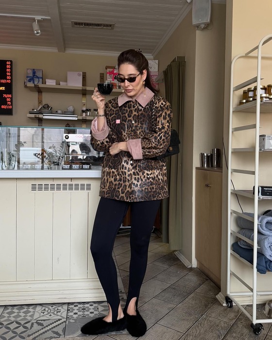 짧은 기장의 레오퍼드 재킷을 선택했다면, 하의는 최대한 미니멀하게 가져가세요. 블랙 레깅스와 퍼 슈즈를 매치하면 편안하면서도 따뜻한 룩이 완성되죠. 혹은 블랙 스타킹을 신어 관능적인 무드를 살짝 더해봐도 좋습니다. 포인트는 최대한 간결하고 깔끔해야 한다는 것. 이렇게 하면 레오퍼드 재킷에 시선이 집중되고 과해 보이지 않는 스타일링이 가능합니다.