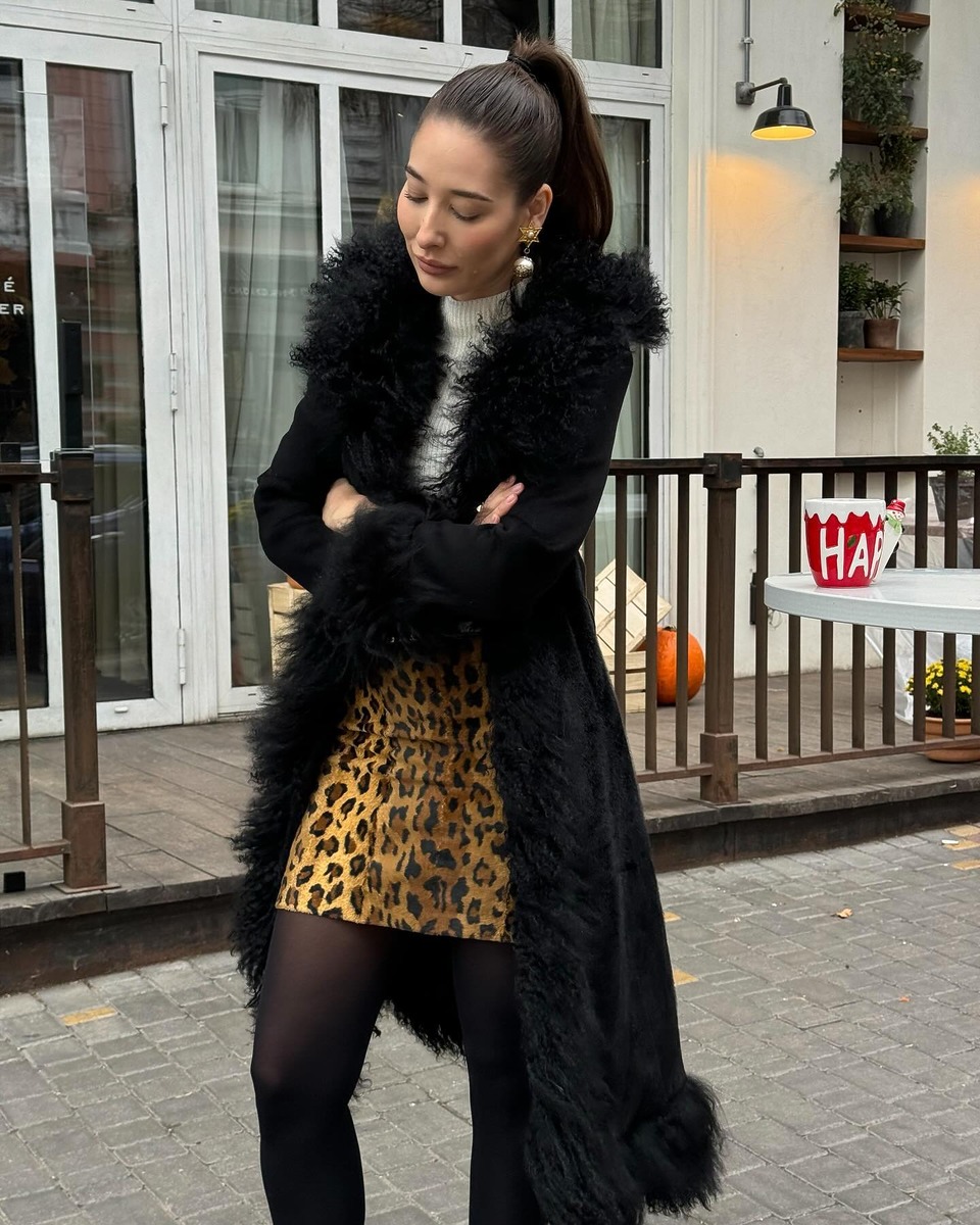 레오퍼드 스커트는 룩에 카리스마를 더하고 싶을 때 제격이죠. 화이트 터틀넥 니트에 레오퍼드 스커트를 매치하고 블랙 롱코트를 걸쳐 글래머러스하면서도 우아한 룩을 완성해 보세요. 이때, 퍼 트리밍 디테일이 있는 코트를 선택하면 룩에 리듬감과 포근함을 더할 수 있을 거예요.