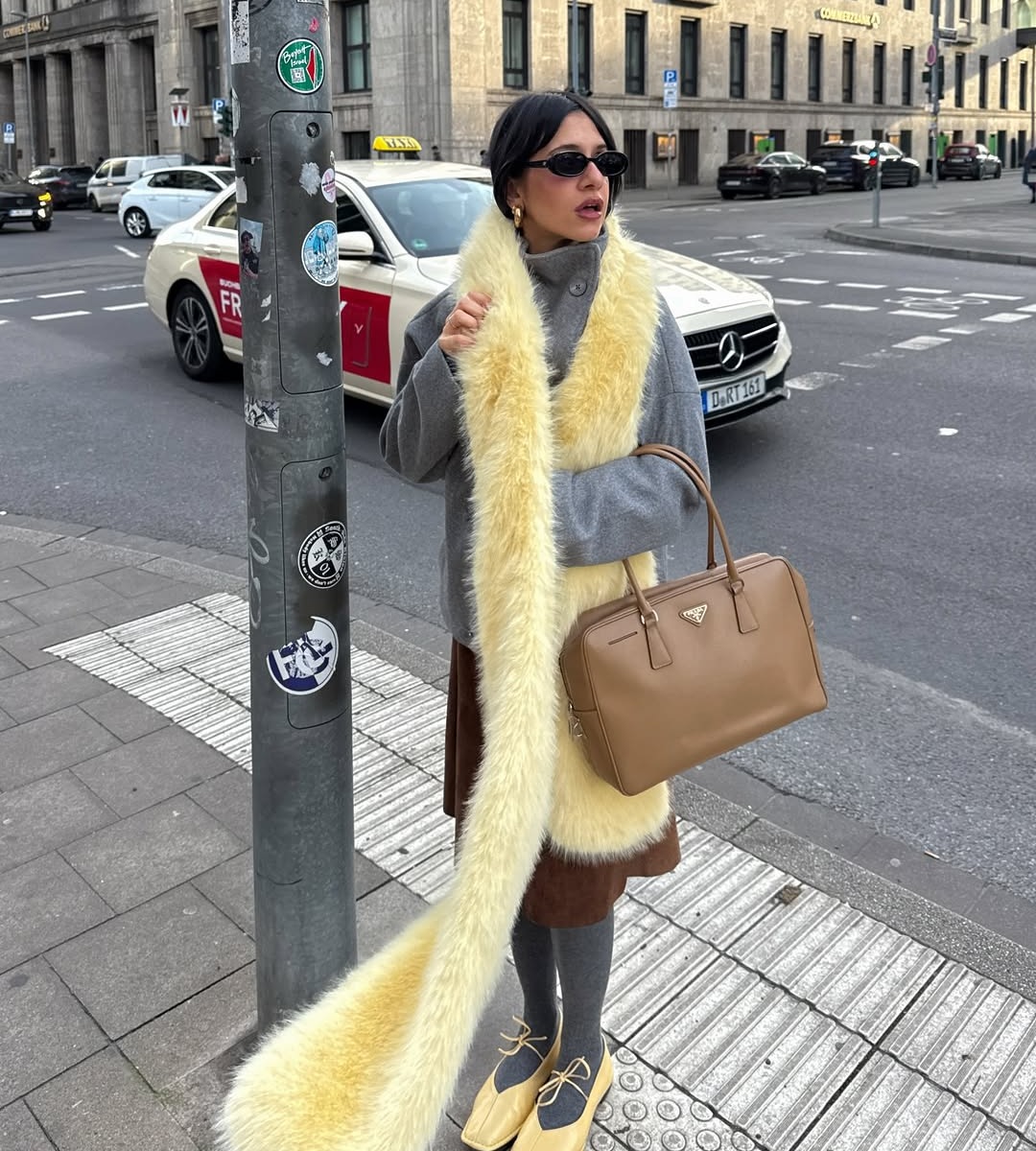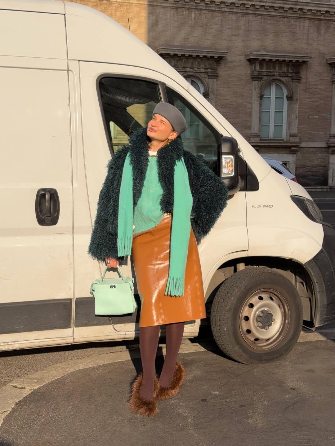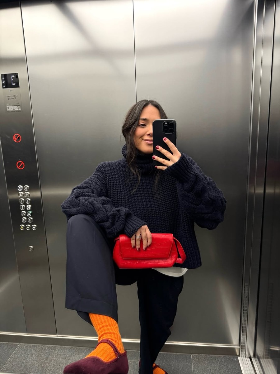 색 온도차를 이용할 수 있는 스타일링 방법을 몇가지 알려줄게요. 차가운 도시 느낌의 차콜 그레이 코트나 니트 안에, 따스함이 뚝뚝 떨어지는 버터 레몬, 옐로우 컬러의 머플러나 이너를 매치하세요. 겨울 룩이 순식간에 ‘포근하고 다정한’ 느낌으로 변하며, 얼굴 색이 환해 보이는 반사판 효과를 줍니다. 그리고 실버 프레임 안경과 실버 주얼리를 착용하고 여기에 쨍한 레드 컬러의 가디건을 어깨에 두르거나 레드 백을 들어보세요. 전형적인 프렌치 시크 무드가 완성된답니다. 하나 더, 깨끗하고 쿨한 화이트 패딩이나 코트에, 따뜻한 구운 오렌지 빛이 도는 테라코타 컬러의 와이드 팬츠나 스커트를 매치하세요. 조용한 럭셔리 느낌을 주면서도 흔하지 않은 색 조합이라 굉장히 고급스러워 보일거에요.