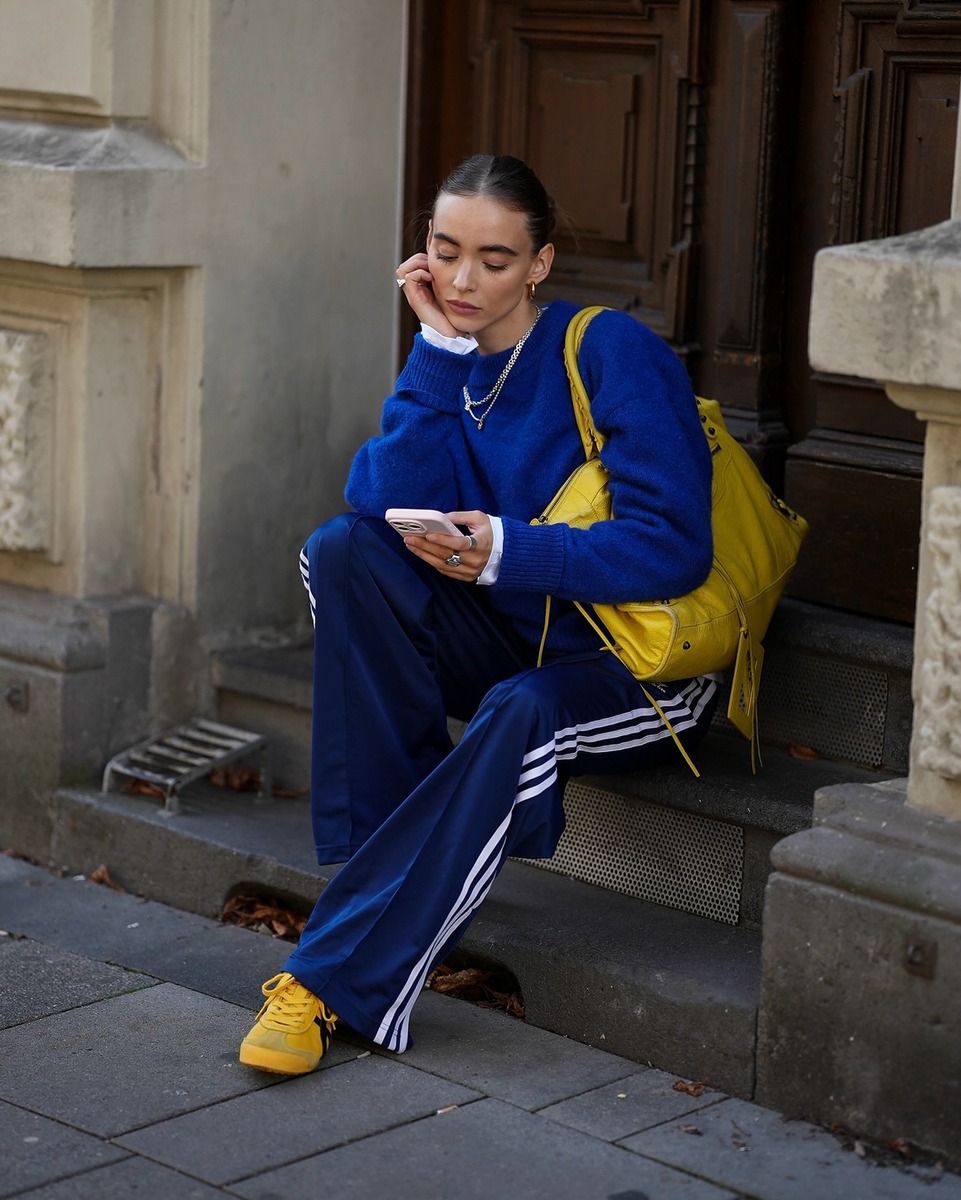선명한 빨강과 옐로 등 2026년의 스니커즈는 좀 더 대담해질 예정입니다. 드리스 반 노튼과 프라다 등은 마치 케첩통과 머스터드 통에 푹 담갔다가 뺀 것 처럼 강렬한 색을 자랑하는 스니커즈들을 선보였어요. 인플루언서 에비는 좀처럼 소화하기 어려운 옐로 스니커즈를 아주 짙은 프러시안 블루의 아이템과 함께 매치해 보색 대비로 연출하는 과감함을 보여줬습니다.
